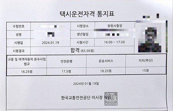 20240119 - 부산 택시운전면허 시험 합격 후기