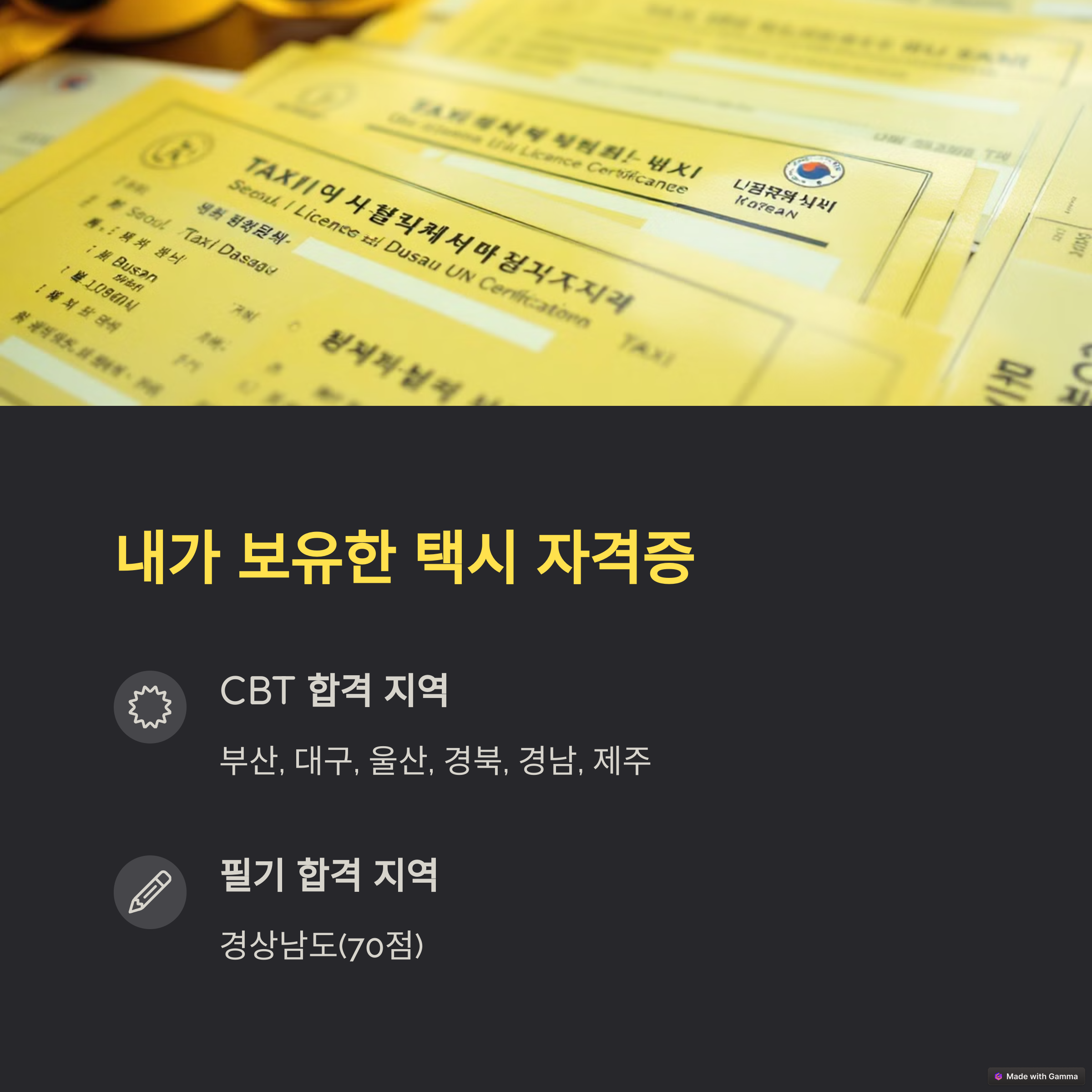 한때 저는 개인택시 준비를 해 보려고 알아 보았으며, 지금은 총 6종의 지역 면허를 확보하고 있습니다.