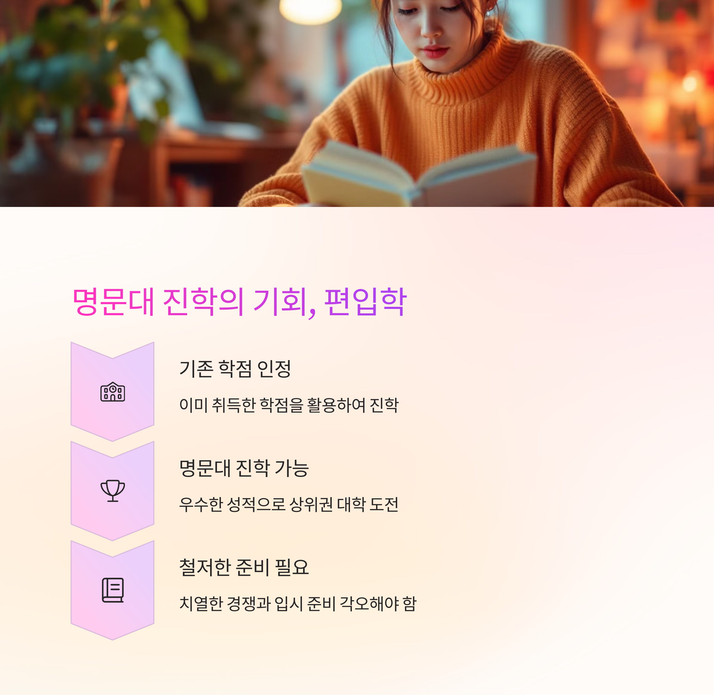 편입학은 기존 대학에서 일정 학점을 이수한 후 4년제 대학으로 편입하는 방식입니다.