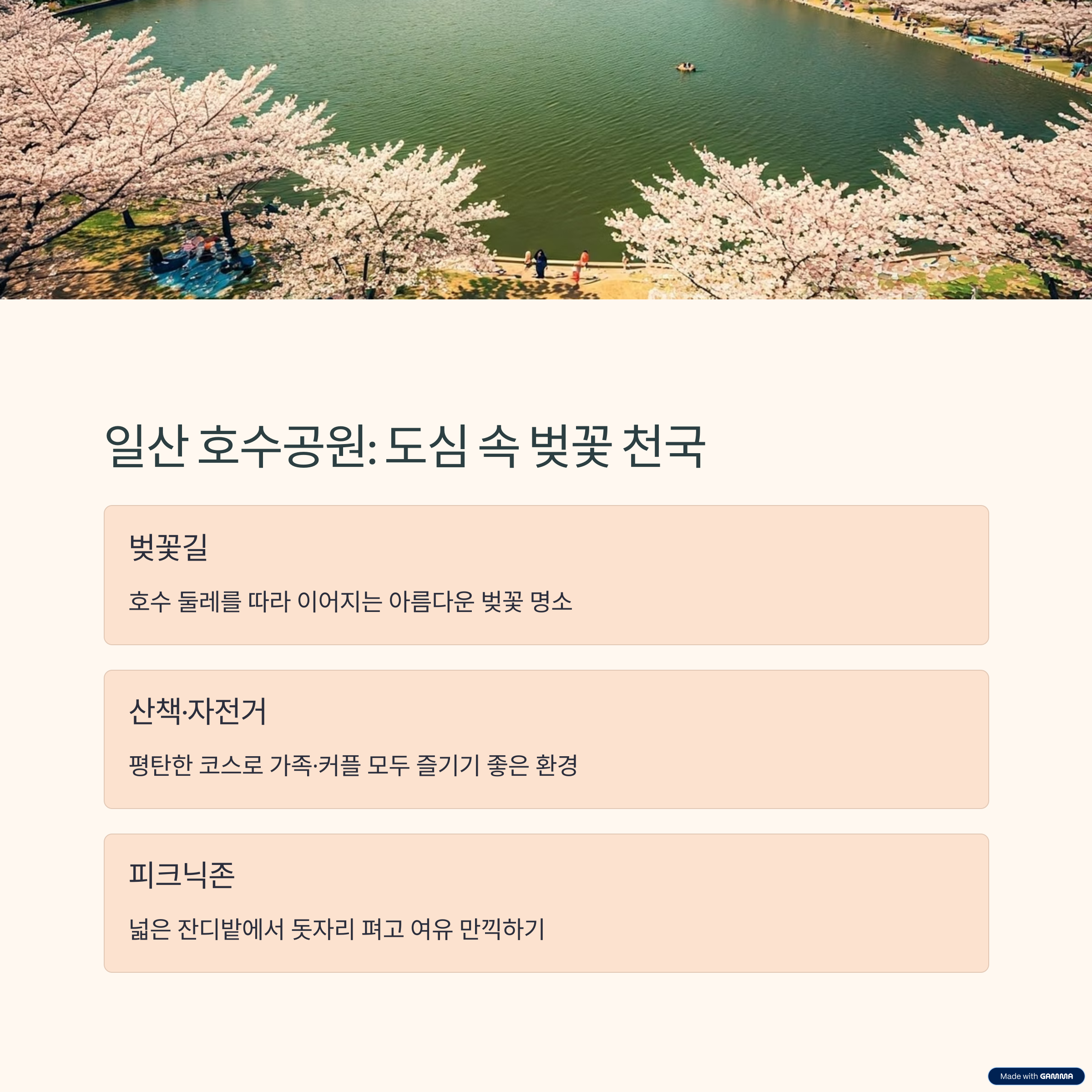 일산 호수공원에서는 벚꽃 아래서 도심 속 쉼표를 찍을 수 있습니다.
