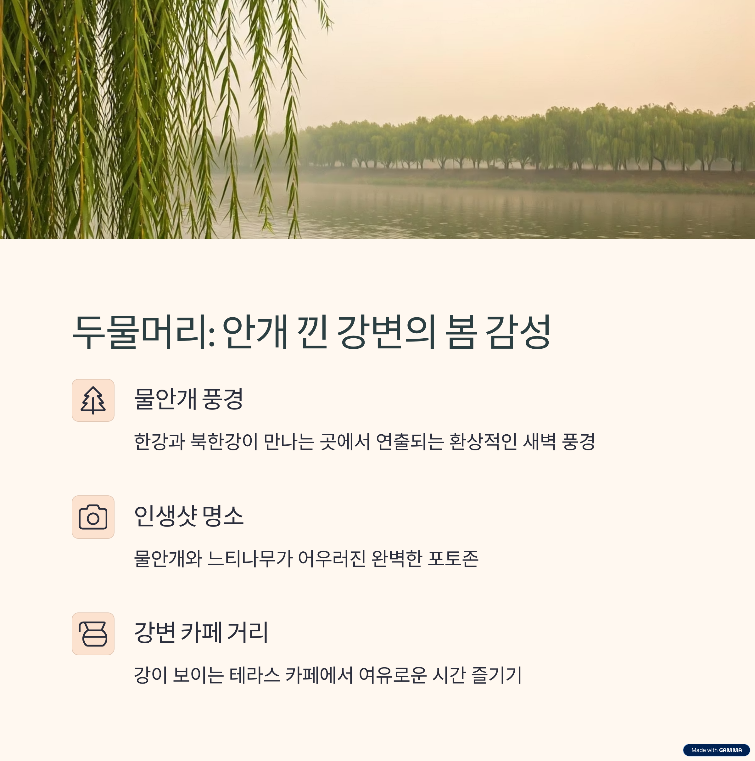 벚꽃, 버드나무, 안개 낀 새벽 풍경이 어우러진 감성 가득한 장소입니다.