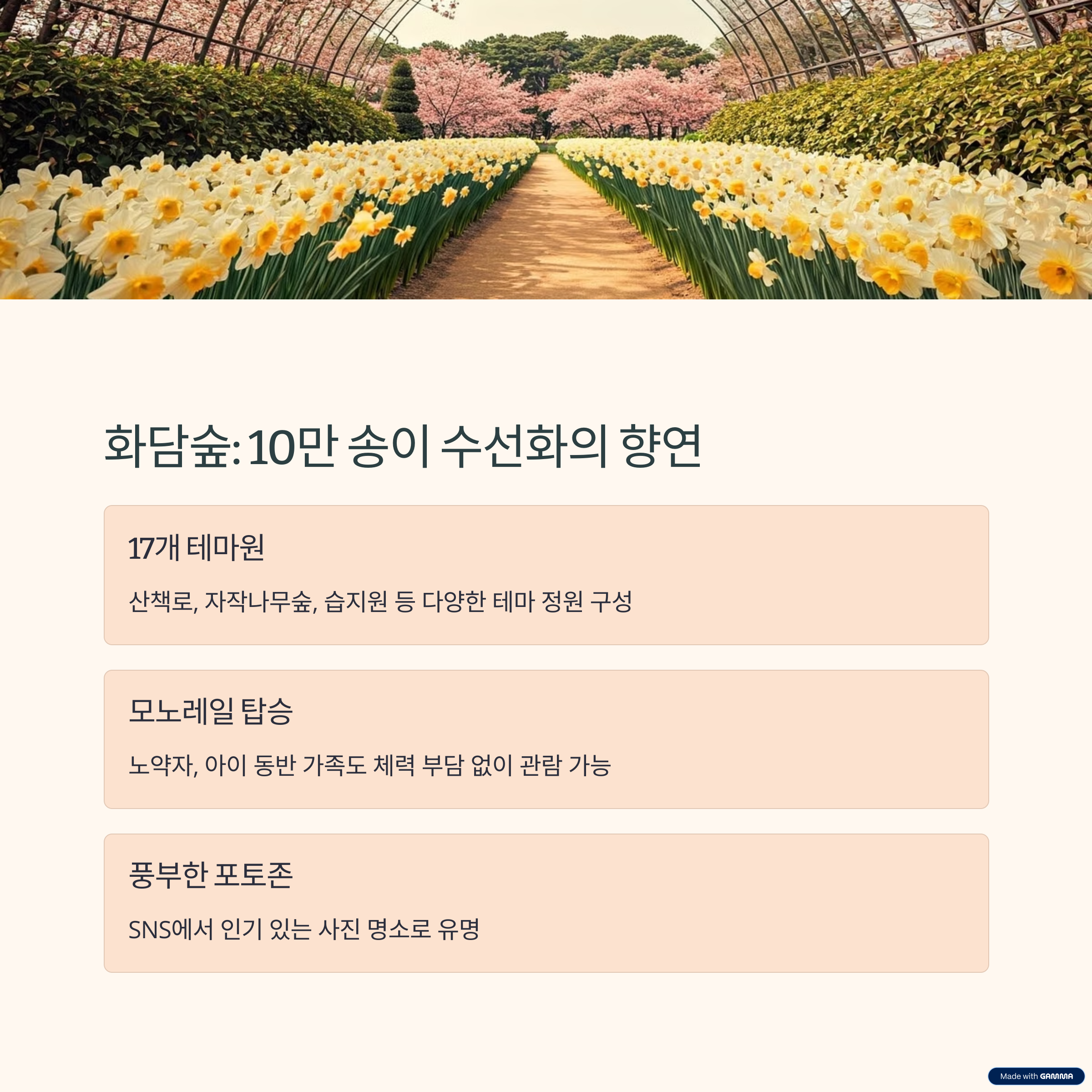 봄 수선화 축제를 중심으로 꽃과 나무가 어우러진 테마 정원이 인상적인 곳입니다.
