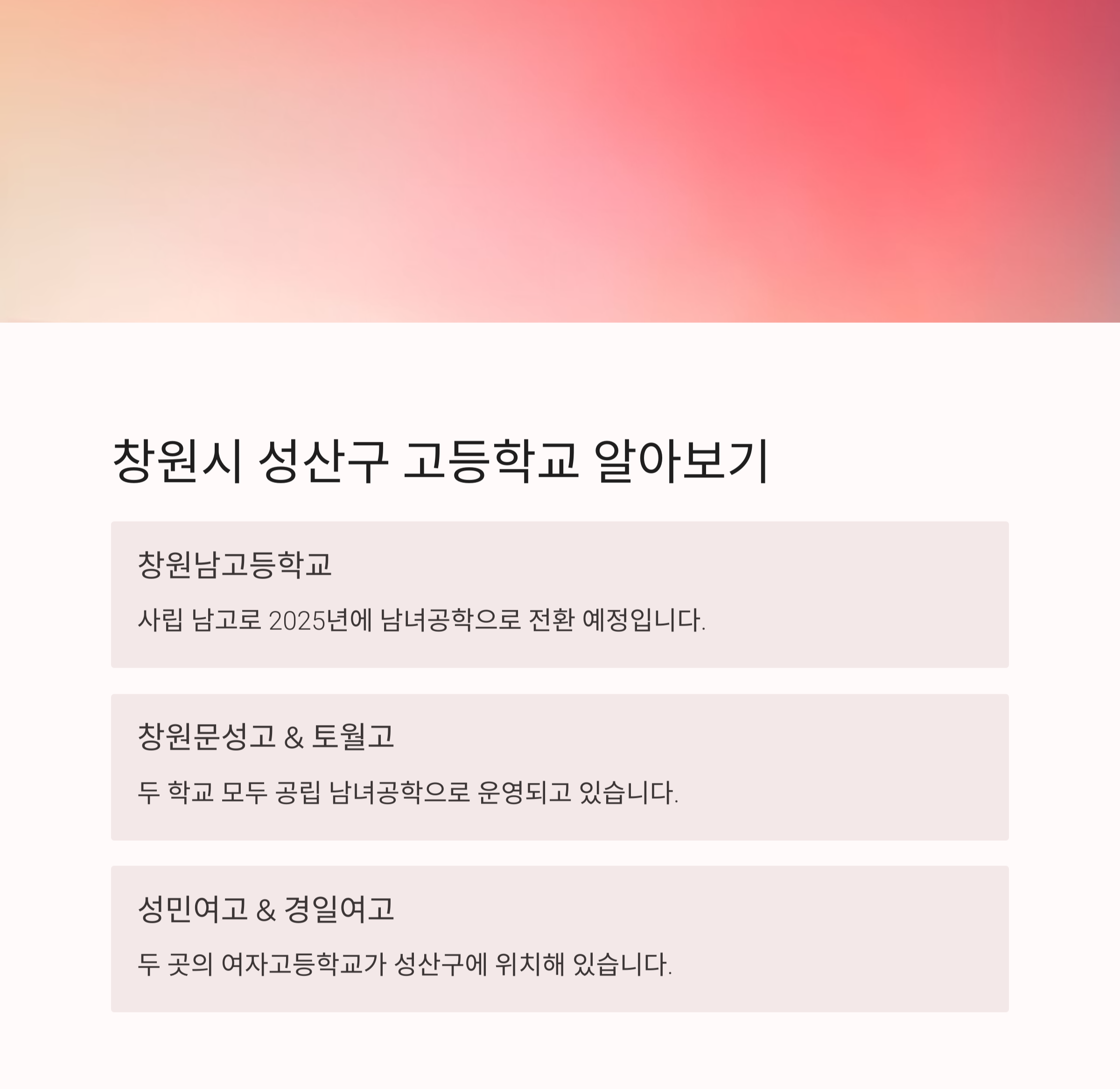 - 총 33개교: 남고 3개(창원남고는 2025년 공학 전환), 여고 10개, 남녀공학 20개(일반고+특성화고).