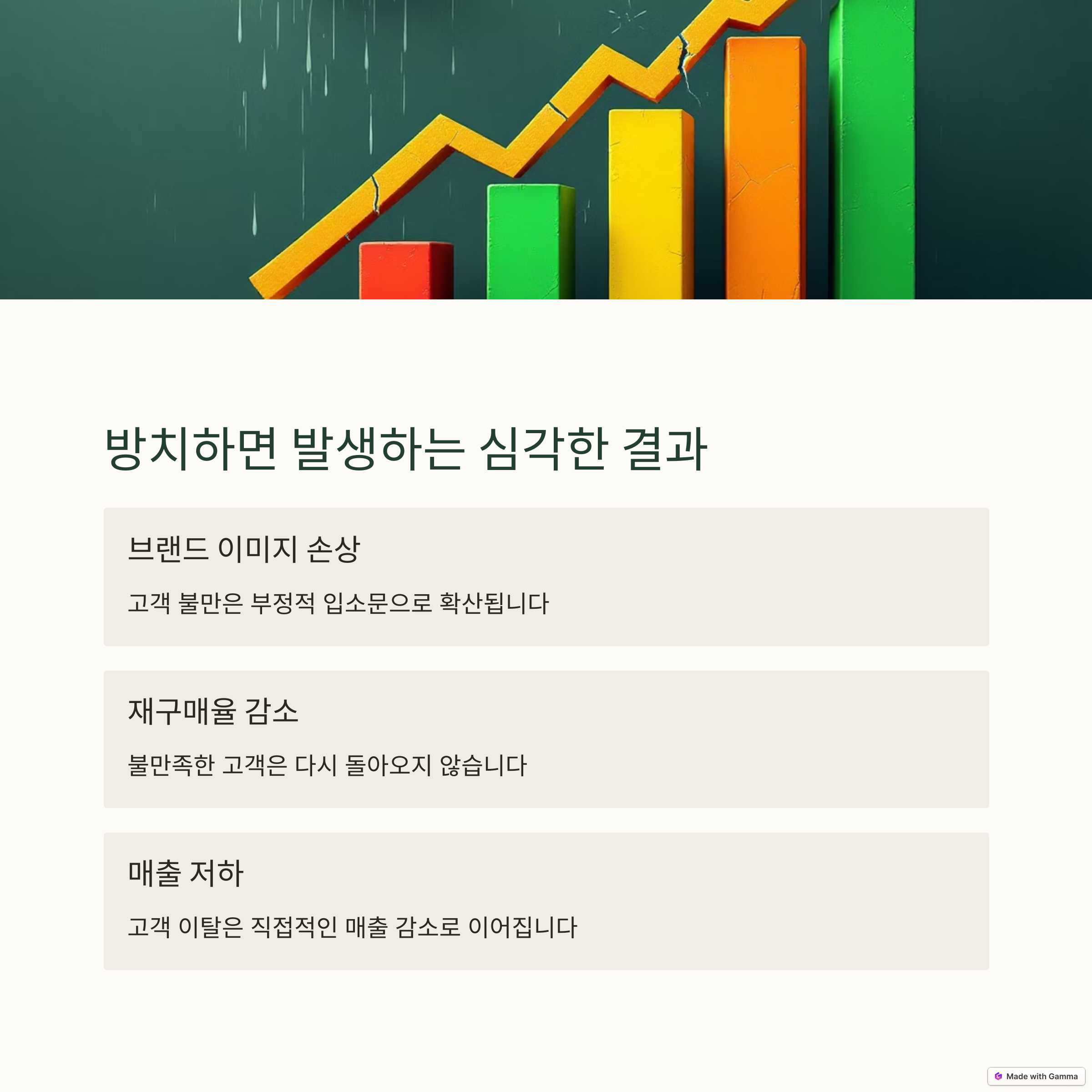 고객의 불만은 즉각적인 대응과 체계적인 해결책을 통해 매출 감소를 막을 수 있습니다.