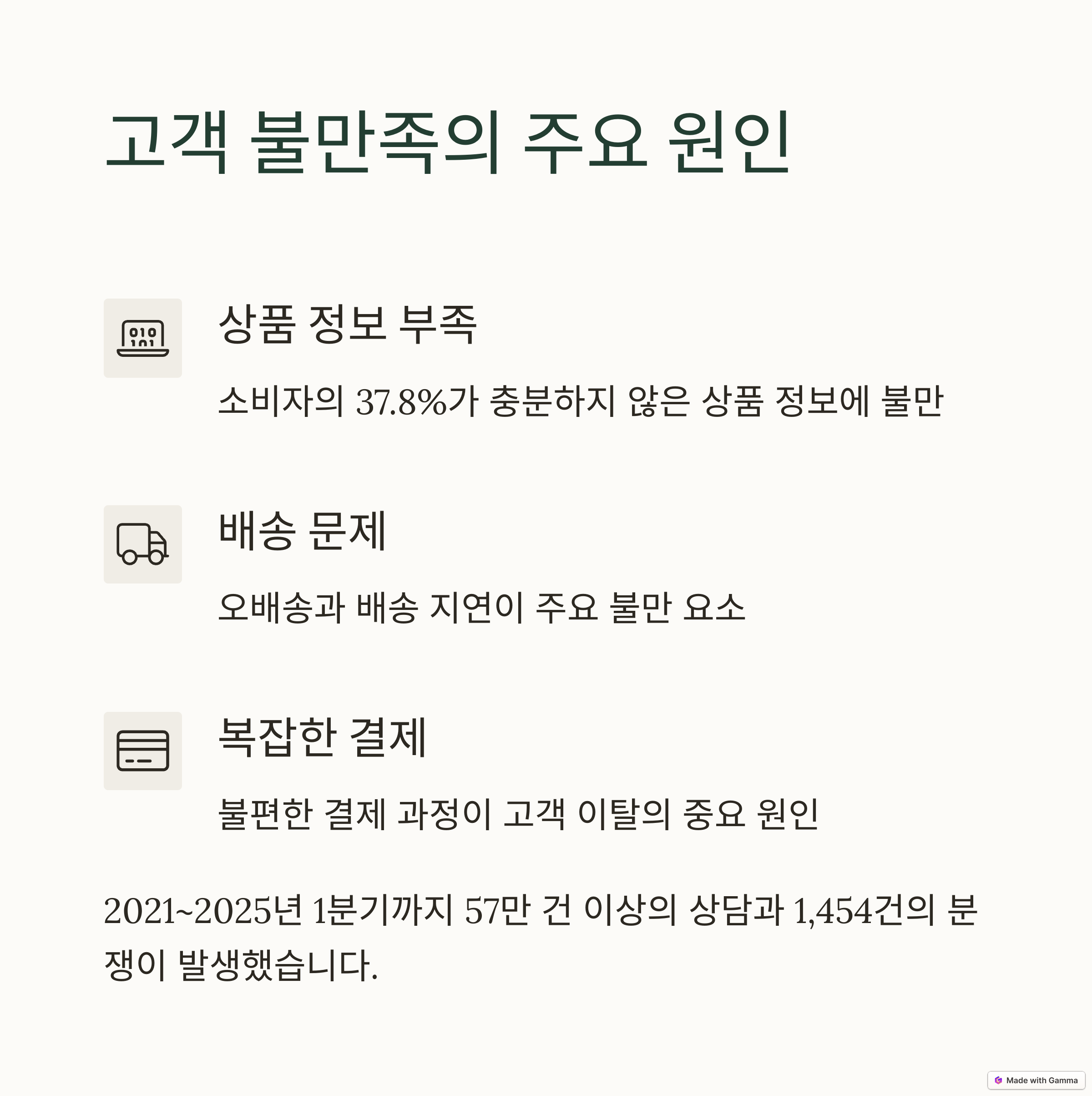 | 품질 문제 | 50% | 불만족 증가 | CS 인프라 개선 필수 |