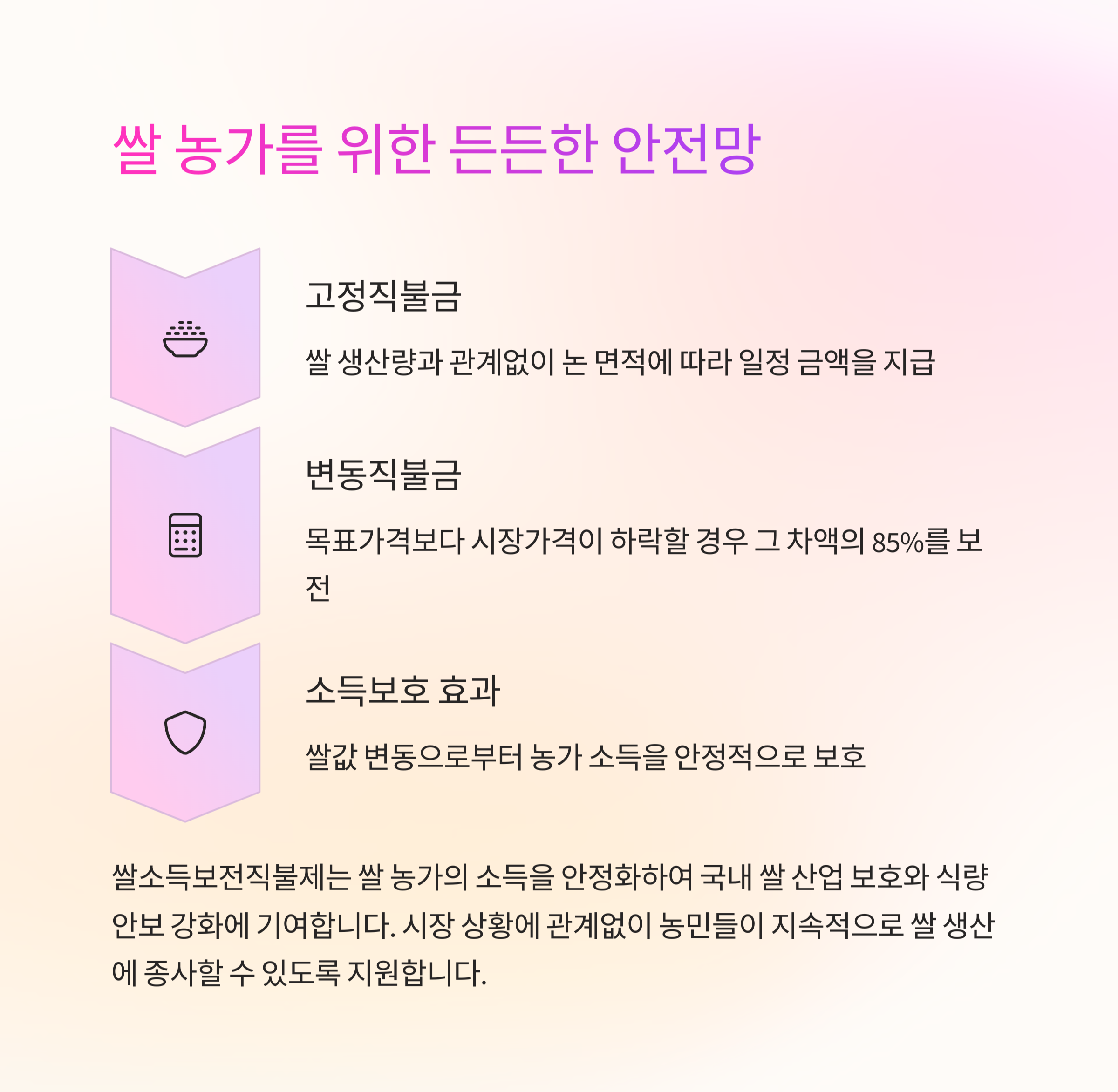 중소 농가 소득 안정 및 형평성 제고 | 쌀값 하락에 따른 소득 손실 보전 | 친환경 농업 장려 및 환경 보호 |