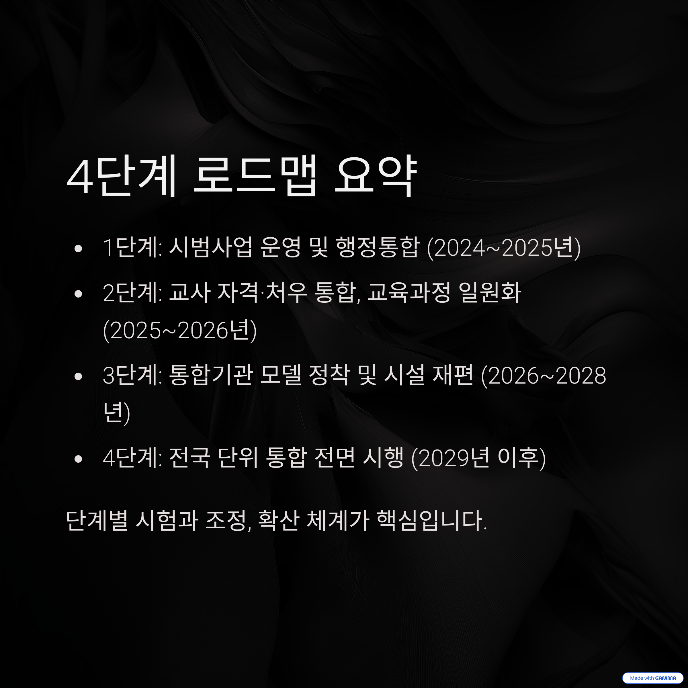 | 2단계 | 교사 자격·처우 통합, 교육과정 일원화 | 2025~2026년 |