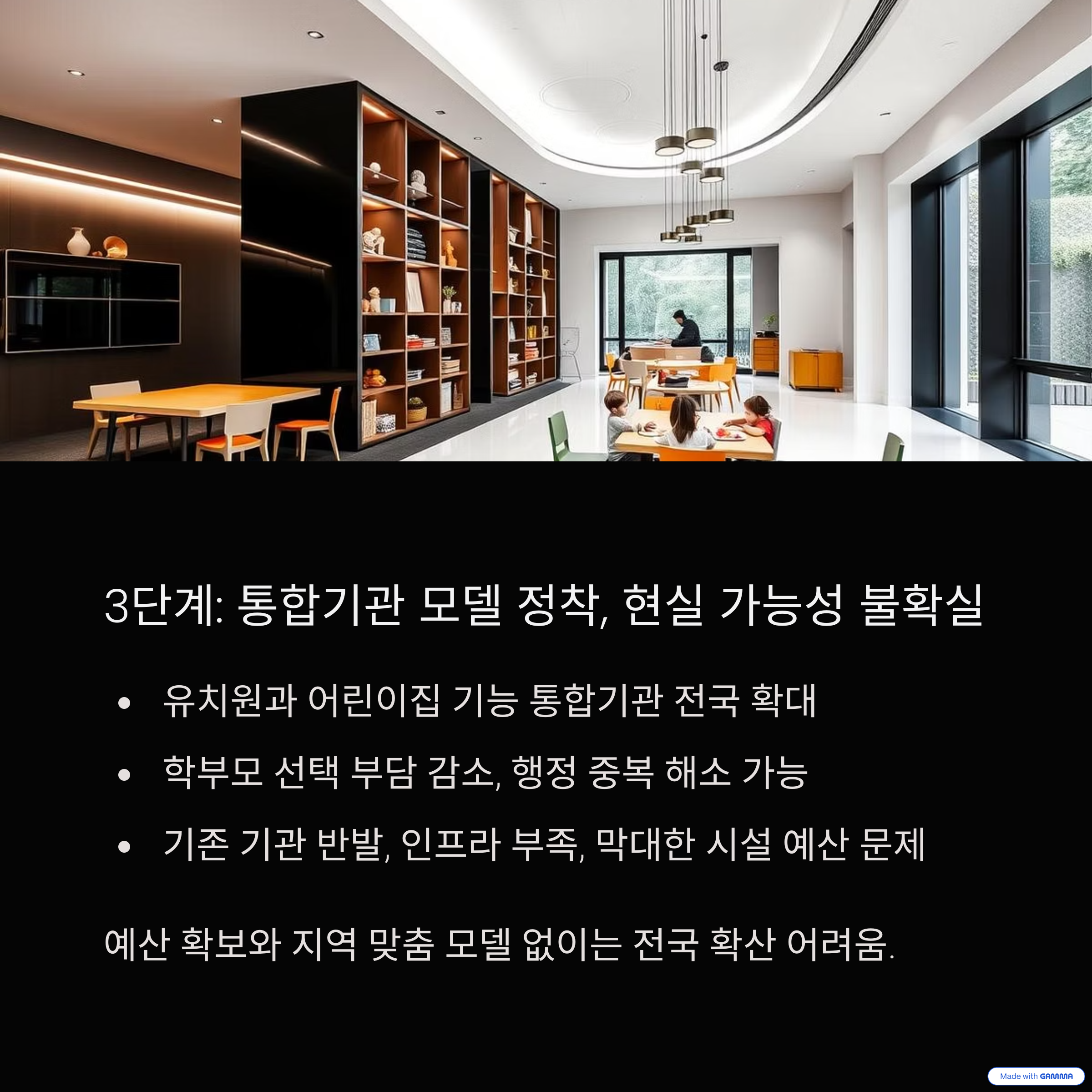 최종 단계는 제도적 기반이 완전히 마련된 이후, 전국 모든 기관을 유보통합 기준으로 운영하는 것입니다.
