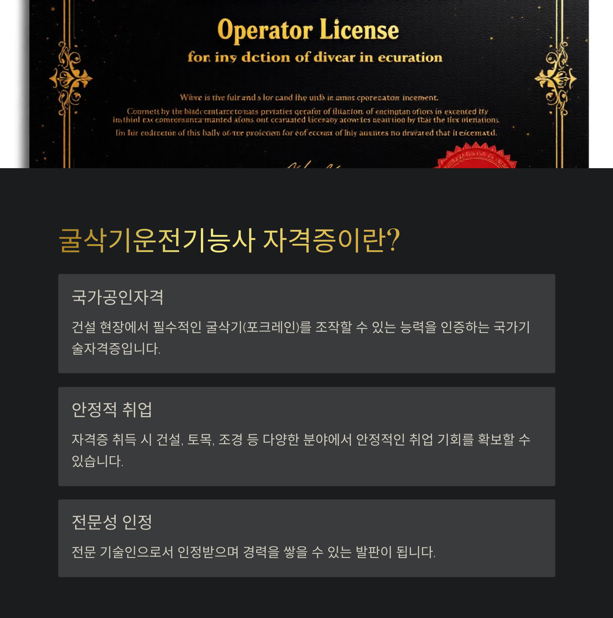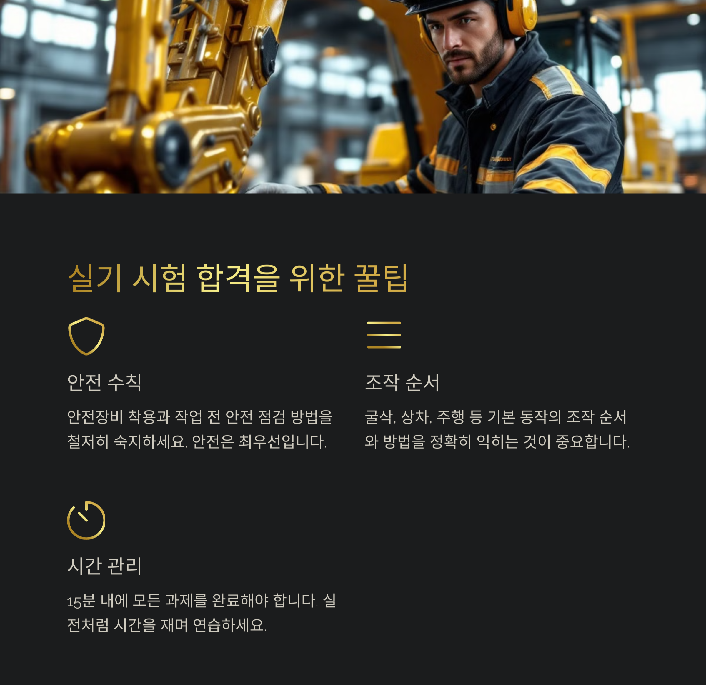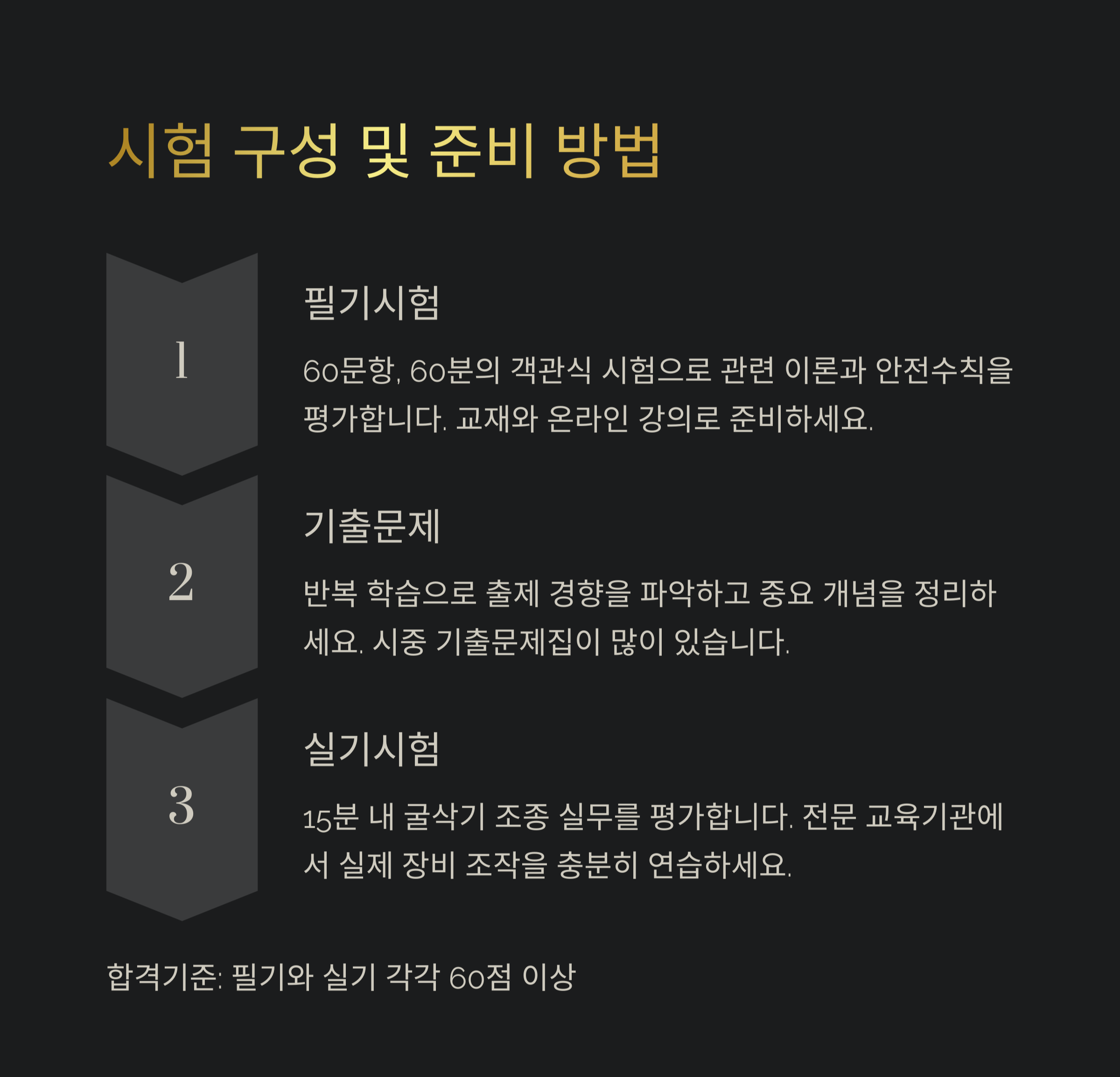 - 실기 시험: 굴삭기 조작 능력 평가 (100점 만점 중 60점 이상 합격)