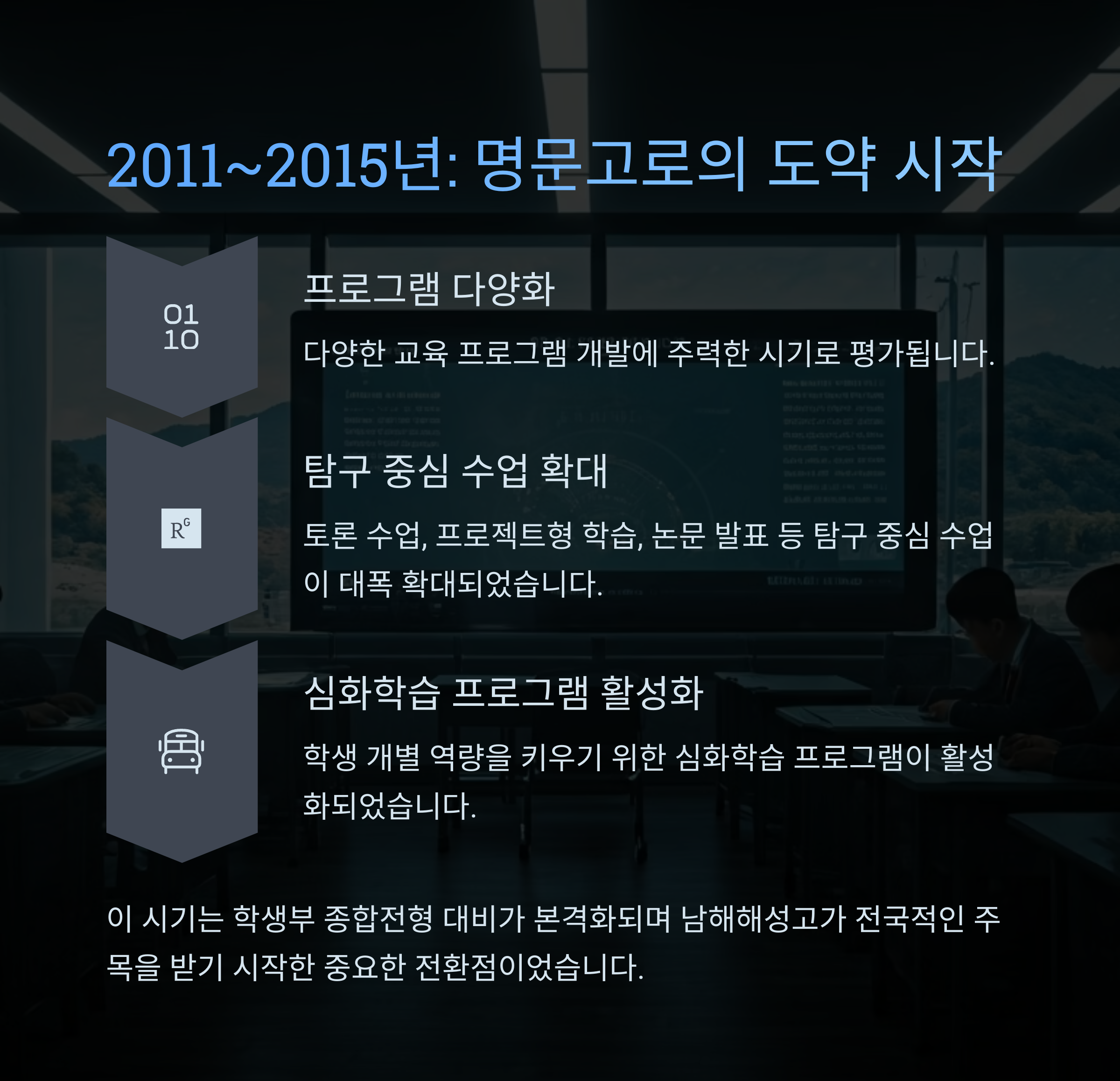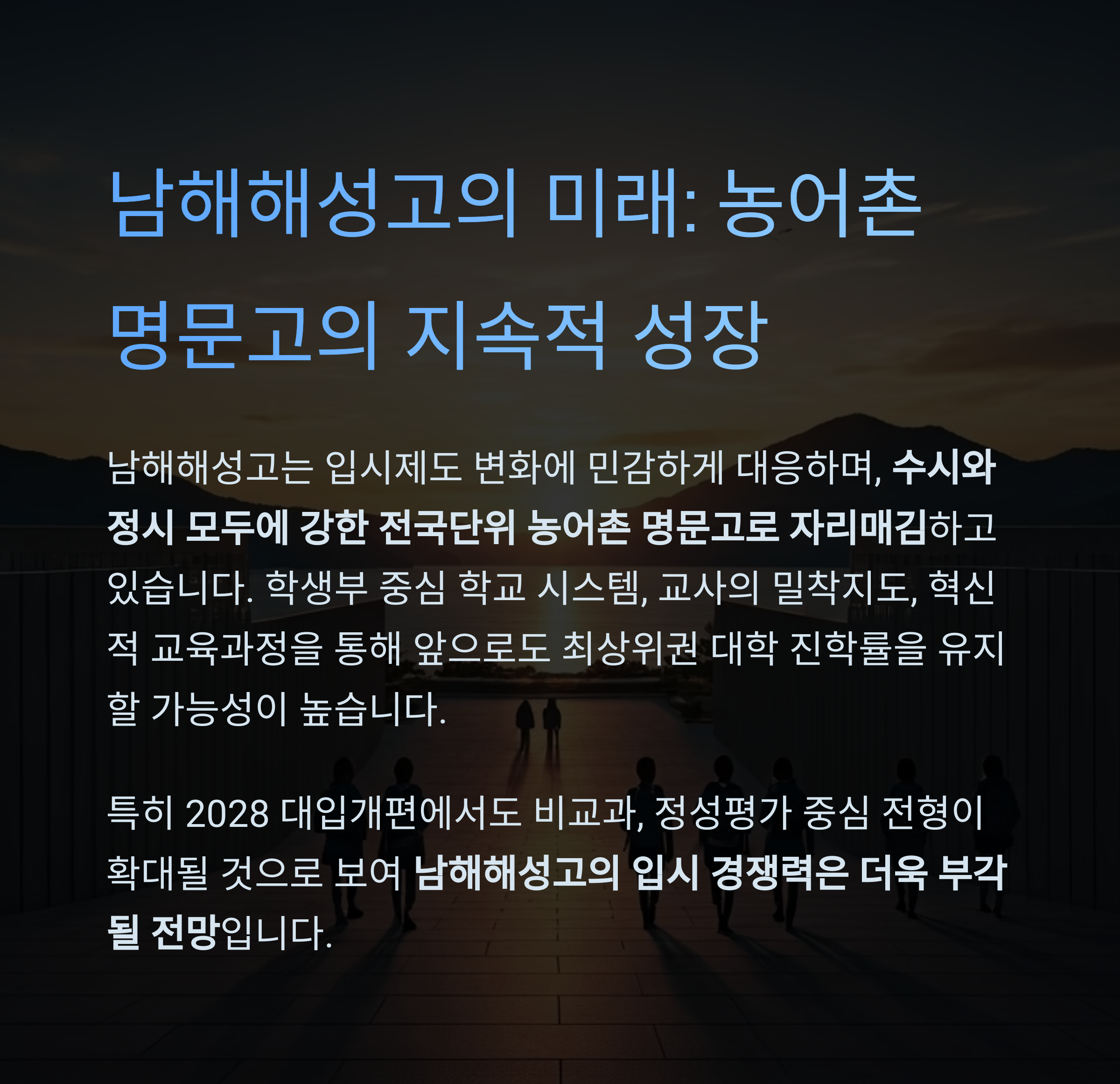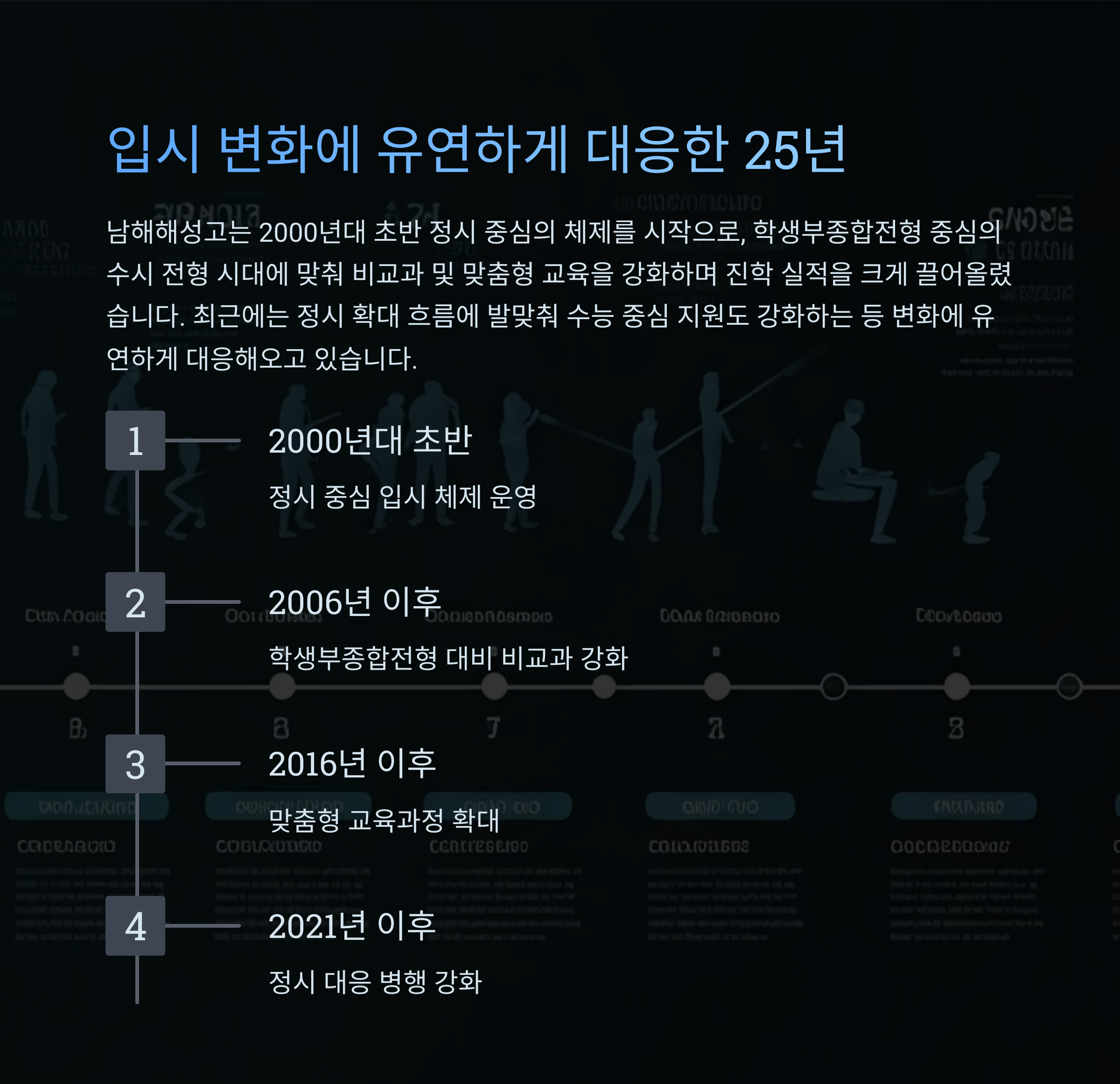 남해해성고는 2000년대 초반 정시 중심의 체제를 시작으로, 학생부종합전형 중심의 수시 전형 시대에 맞춰 비교과 및 맞춤형 교육을 강화하며 진학 실적을 크게 끌어올렸습니다.