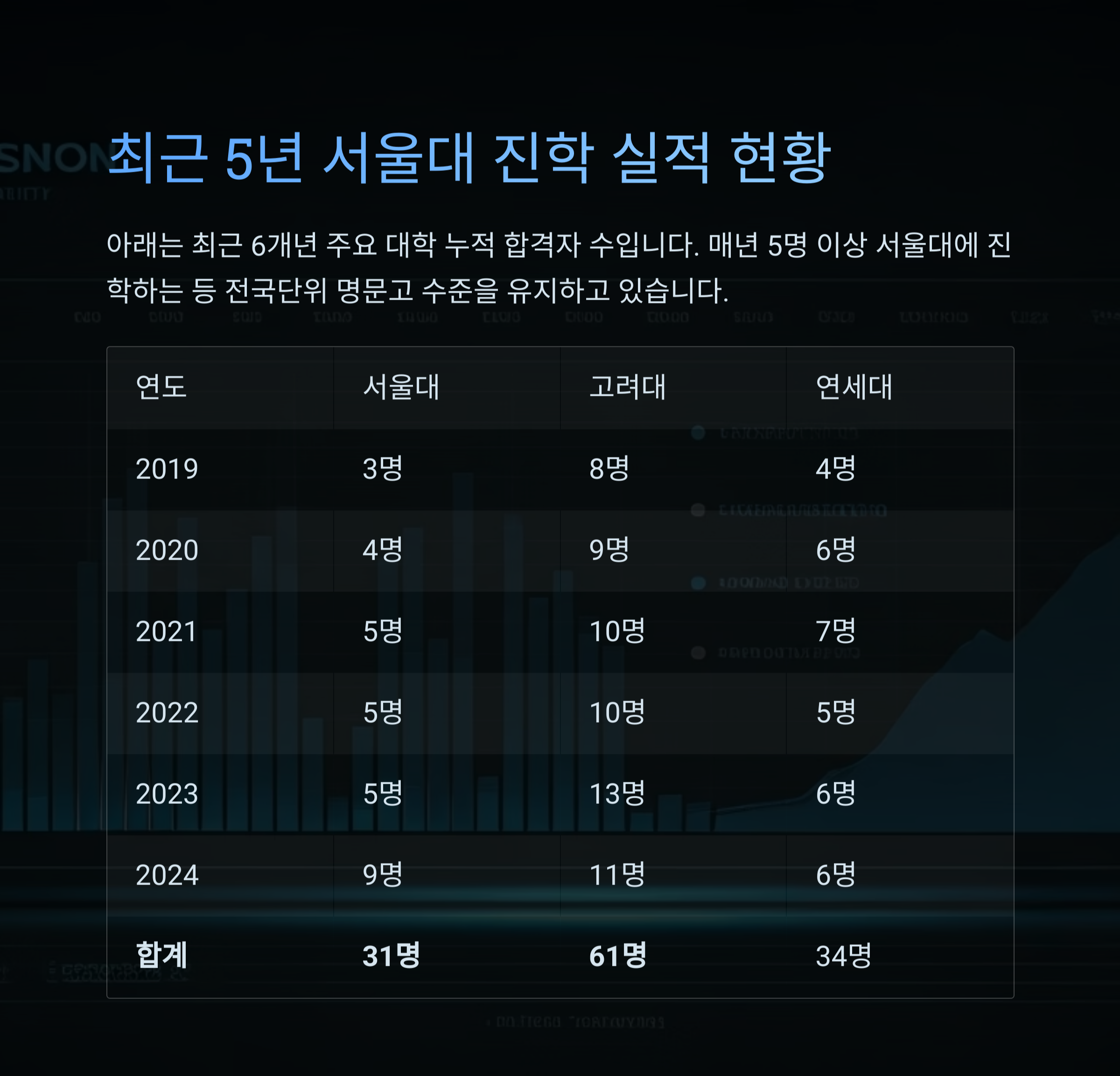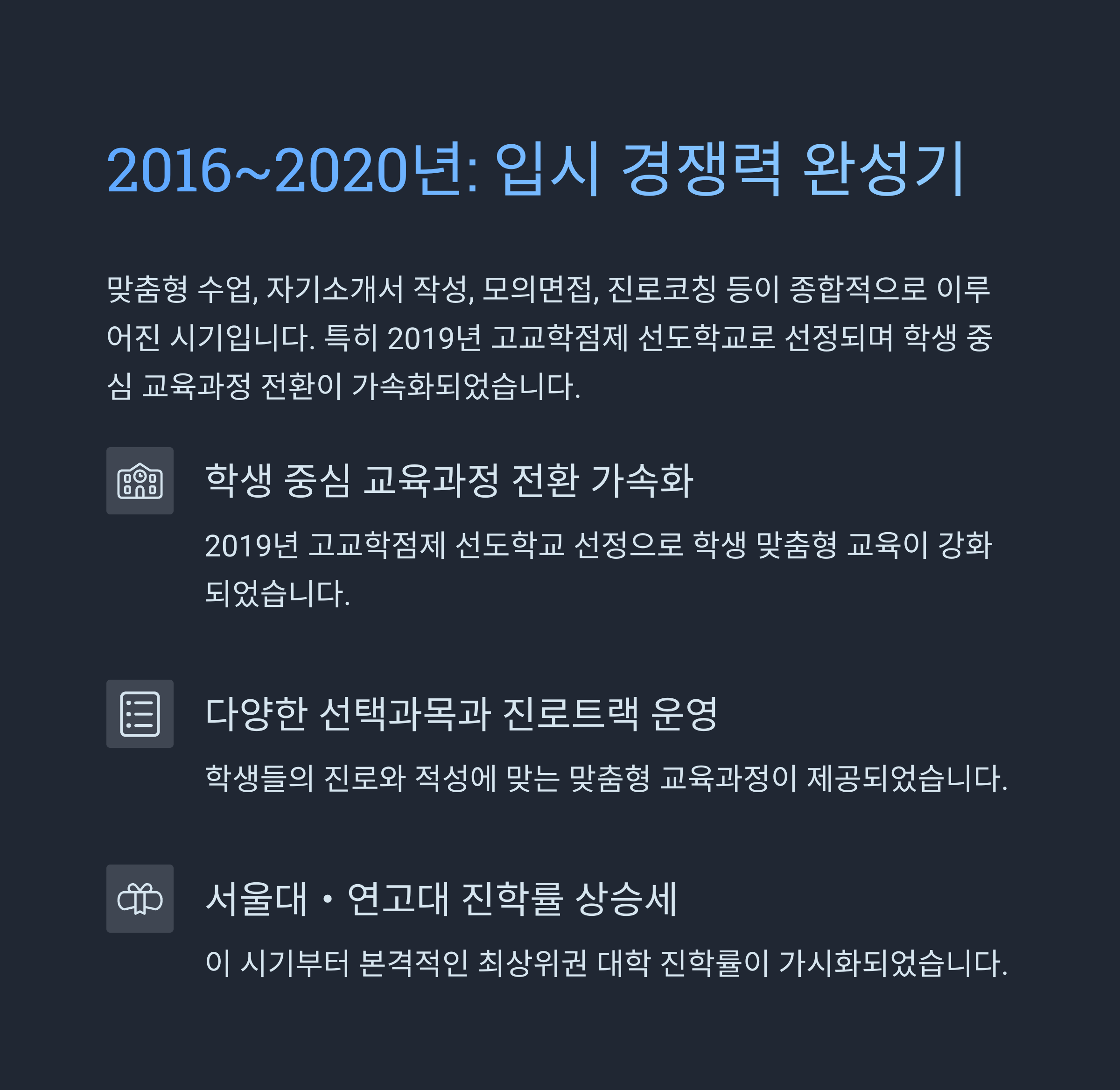 서울대 등 주요 대학의 합격 실적과 더불어 교육 혁신에도 앞장서며, 전국 상위권 입시 경쟁력을 갖춘 학교로 평가받고 있습니다.