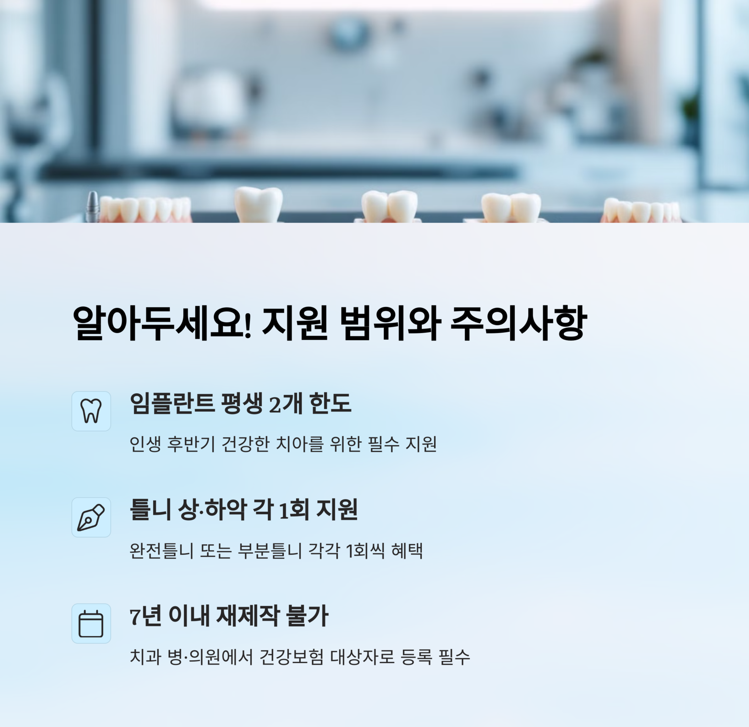 임플란트는 평생 최대 2개까지 지원되며, 틀니는 상·하악 각각 1회만 건강보험 적용이 가능합니다. 또한, 7년 이내에는 재제작이 불가하므로 신중한 선택이 필요합니다. 병·의원에서 건강보험 대상자로 등록한 후 시술을 받을 수 있으며, 치과 상담을 통해 본인의 구강 상태에 가장 적합한 시술을 선택하는 것이 중요합니다.