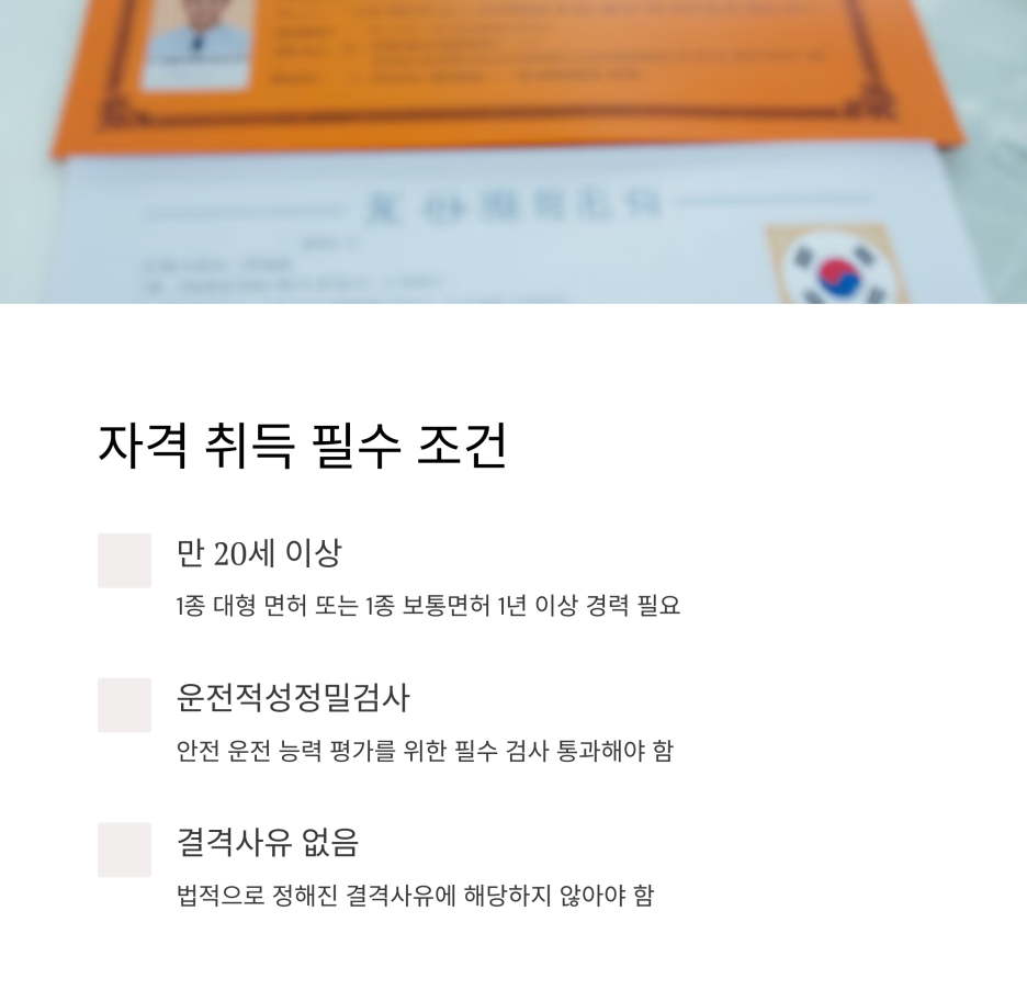 - 면허: 1종 대형면허 취득 후 최소 1년 이상 경과