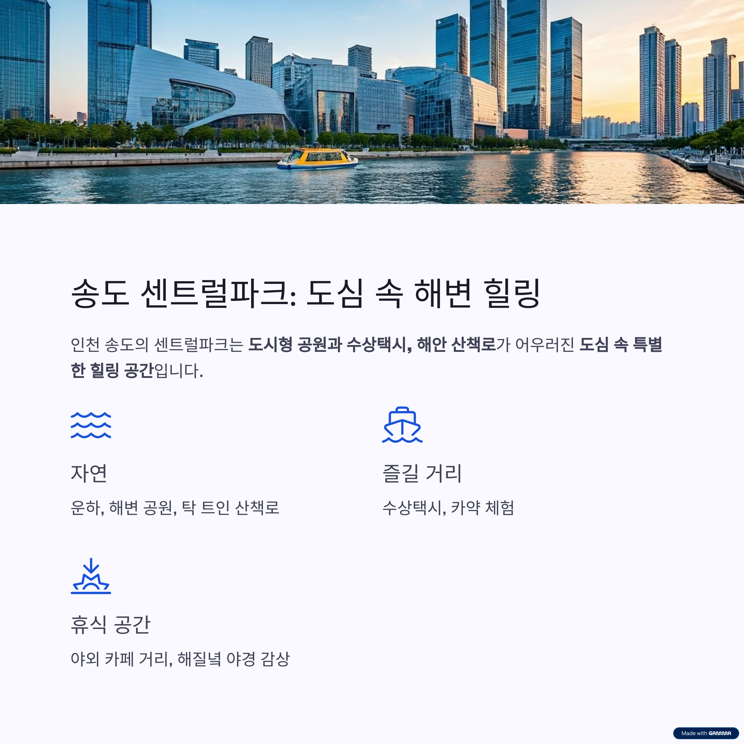 도시형 공원과 수상택시, 해안 산책로가 어우러진