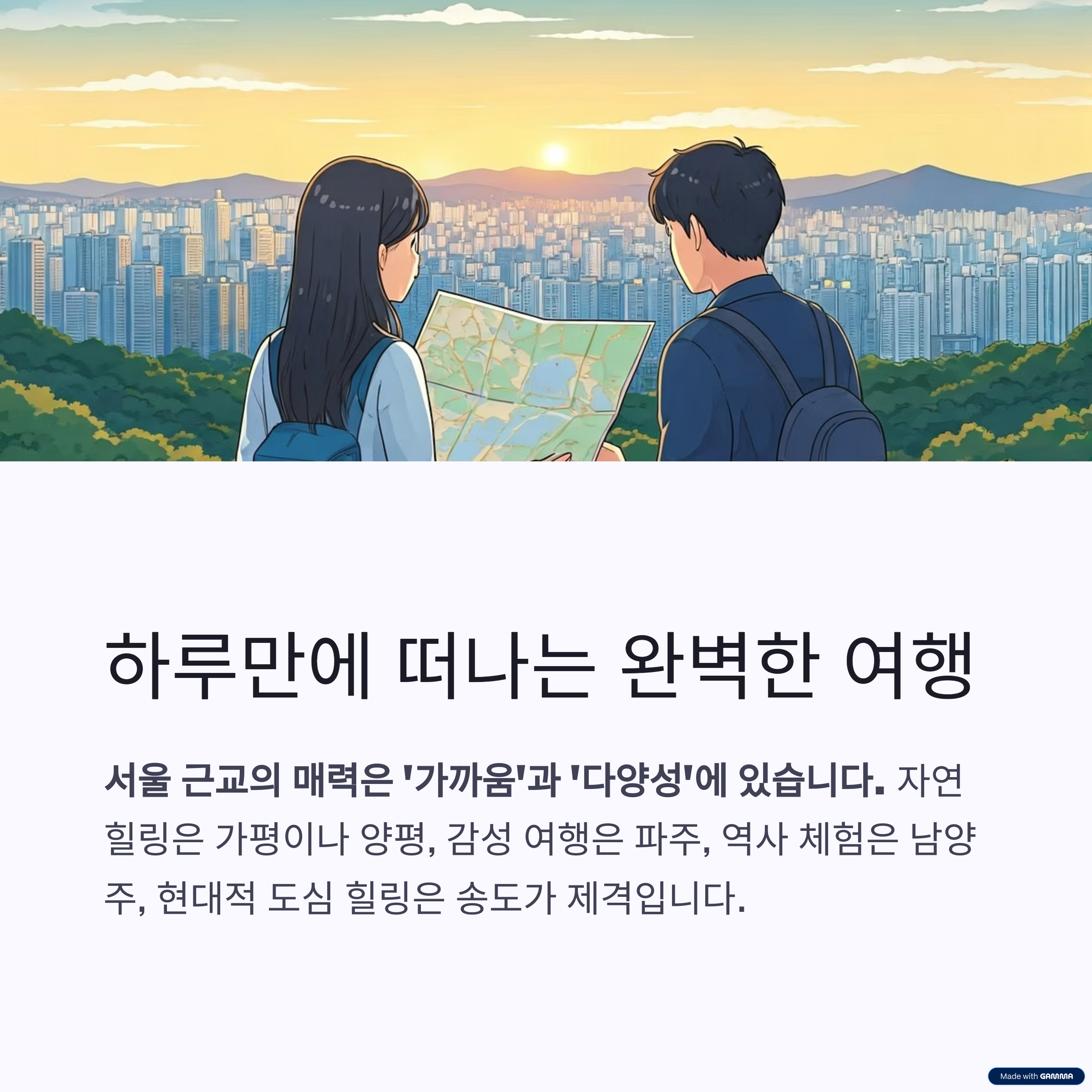 서울 근교의 매력은 ‘가까움’과 ‘다양성’에 있습니다.
