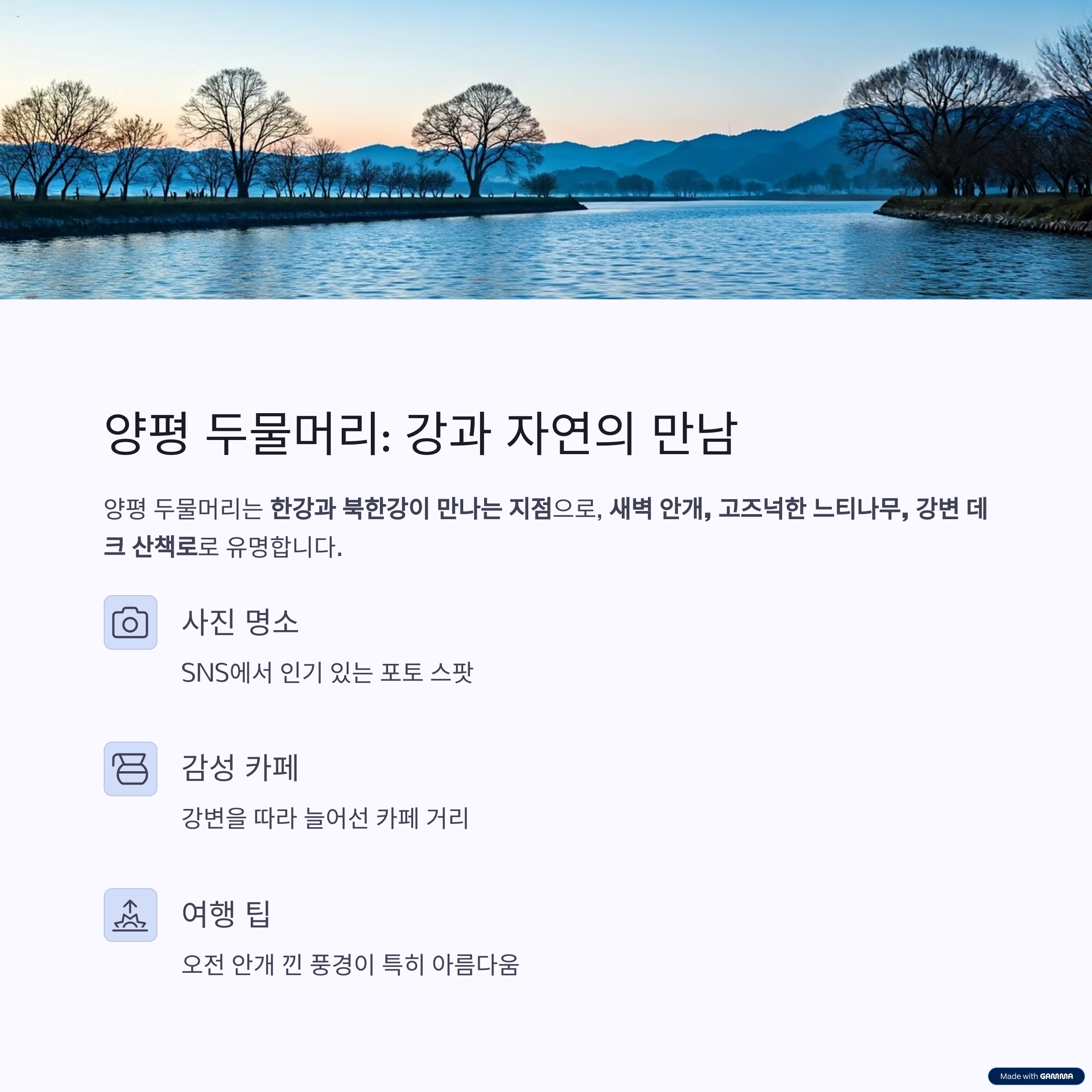새벽 안개, 고즈넉한 느티나무, 강변 데크 산책로로 유명합니다.