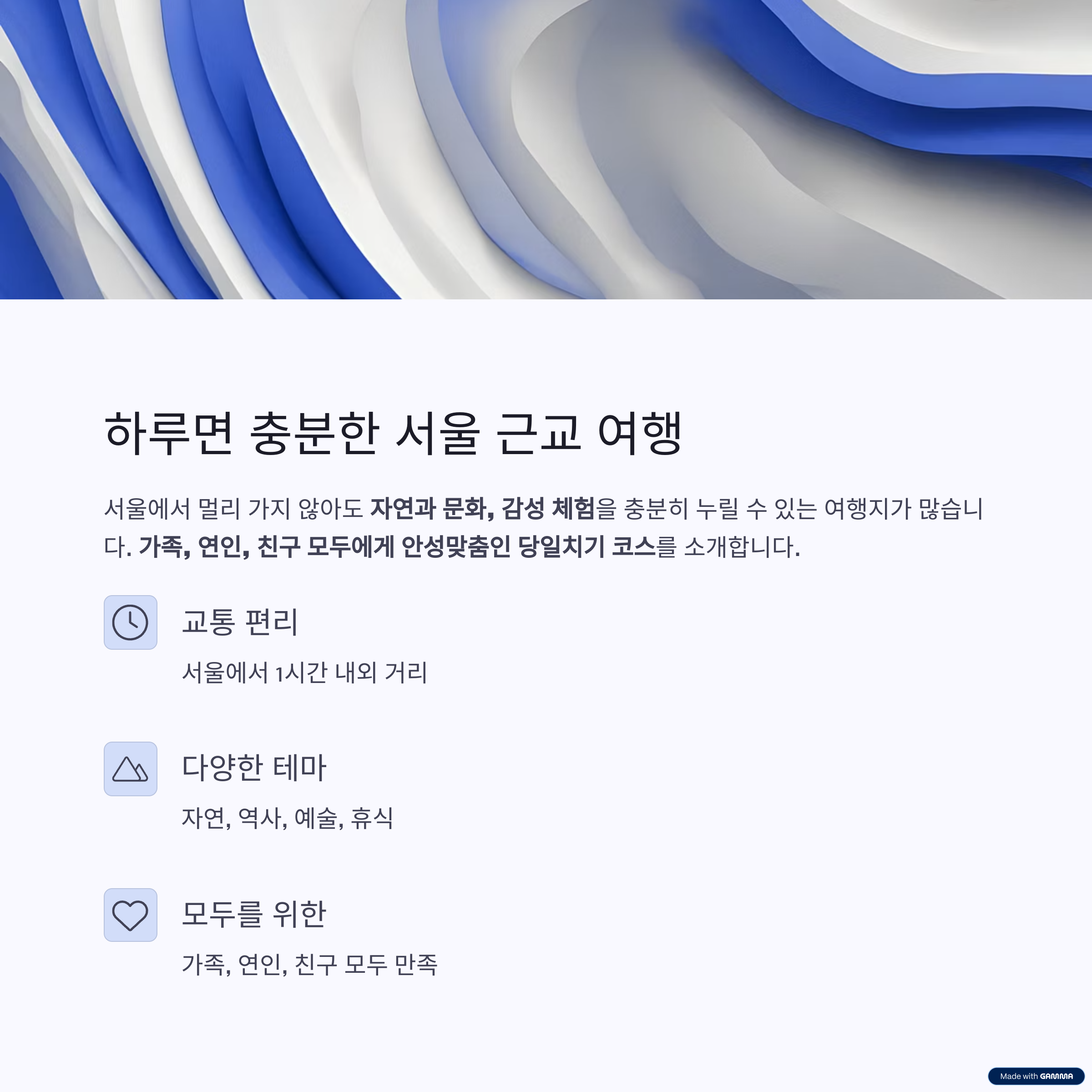 서울에서 멀리 가지 않아도 자연과 문화, 감성 체험을 충분히 누릴 수 있는 여행지가 많습니다.
