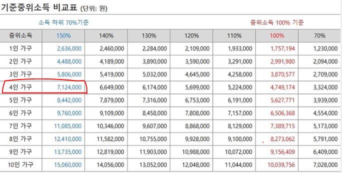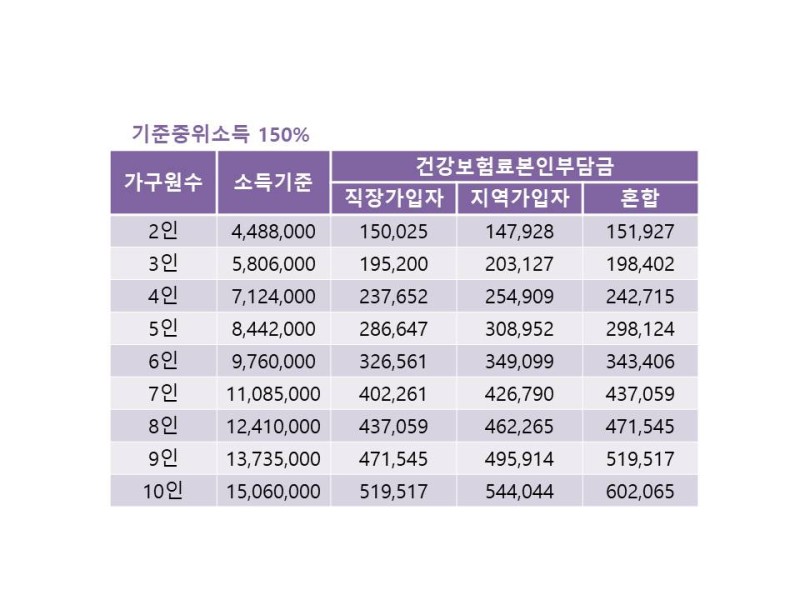 기준중위소득 150%로 정했기에, 가구원수에 대한 #세전월소득기준의