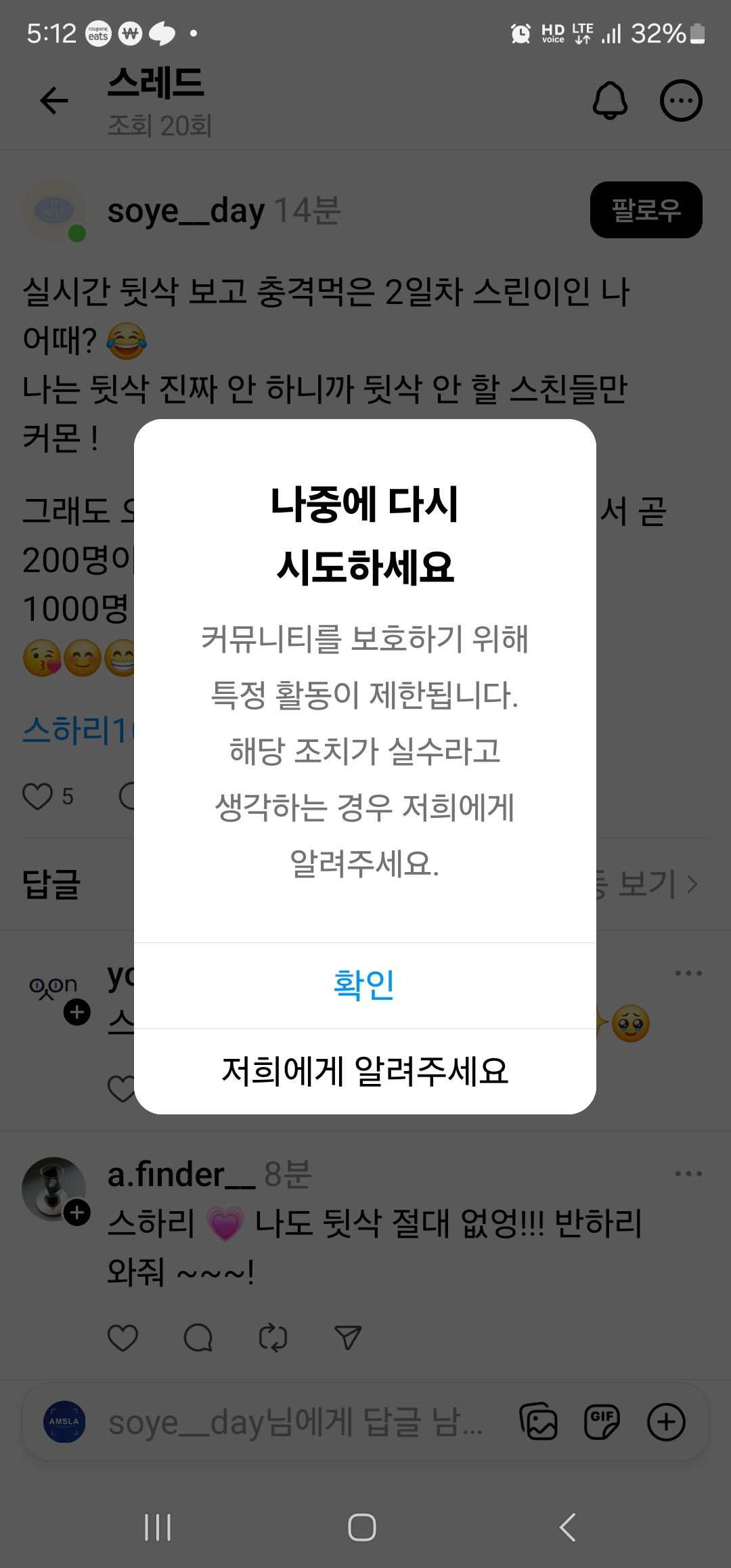 아마도 짧은 시간 안에 너무 많은 팔로우, 좋아요, 댓글 등을 해서 스레드 측에서 '매크로'나 '봇'으로 인식한 것 같아요. 실제로 스레드는 과도한 활동에 제한을 둔다고 하네요.