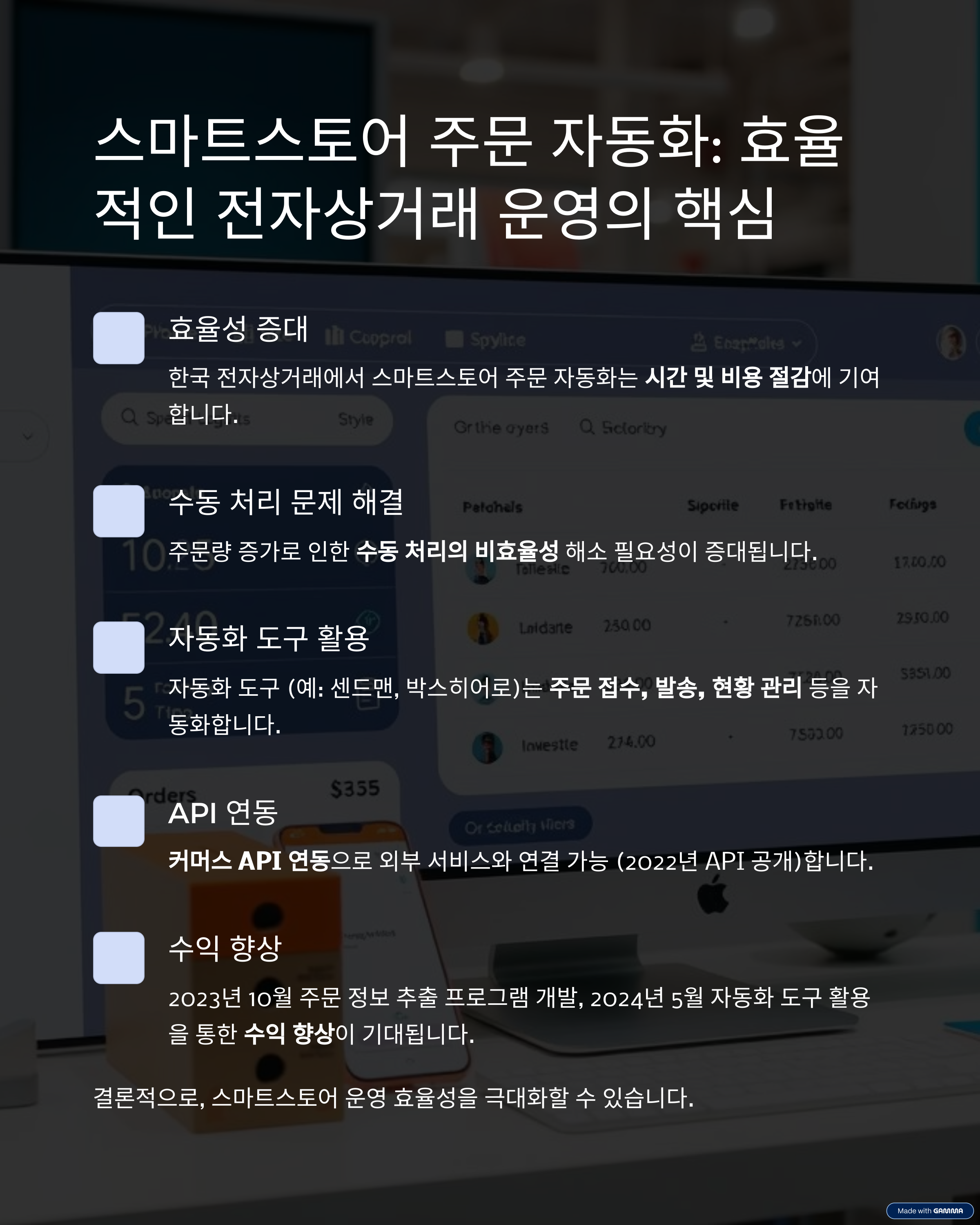 스마트스토어 사용자는 주문량 증가에 따라 자동화 도구를 통해 효율성을 높일 필요가 있습니다.