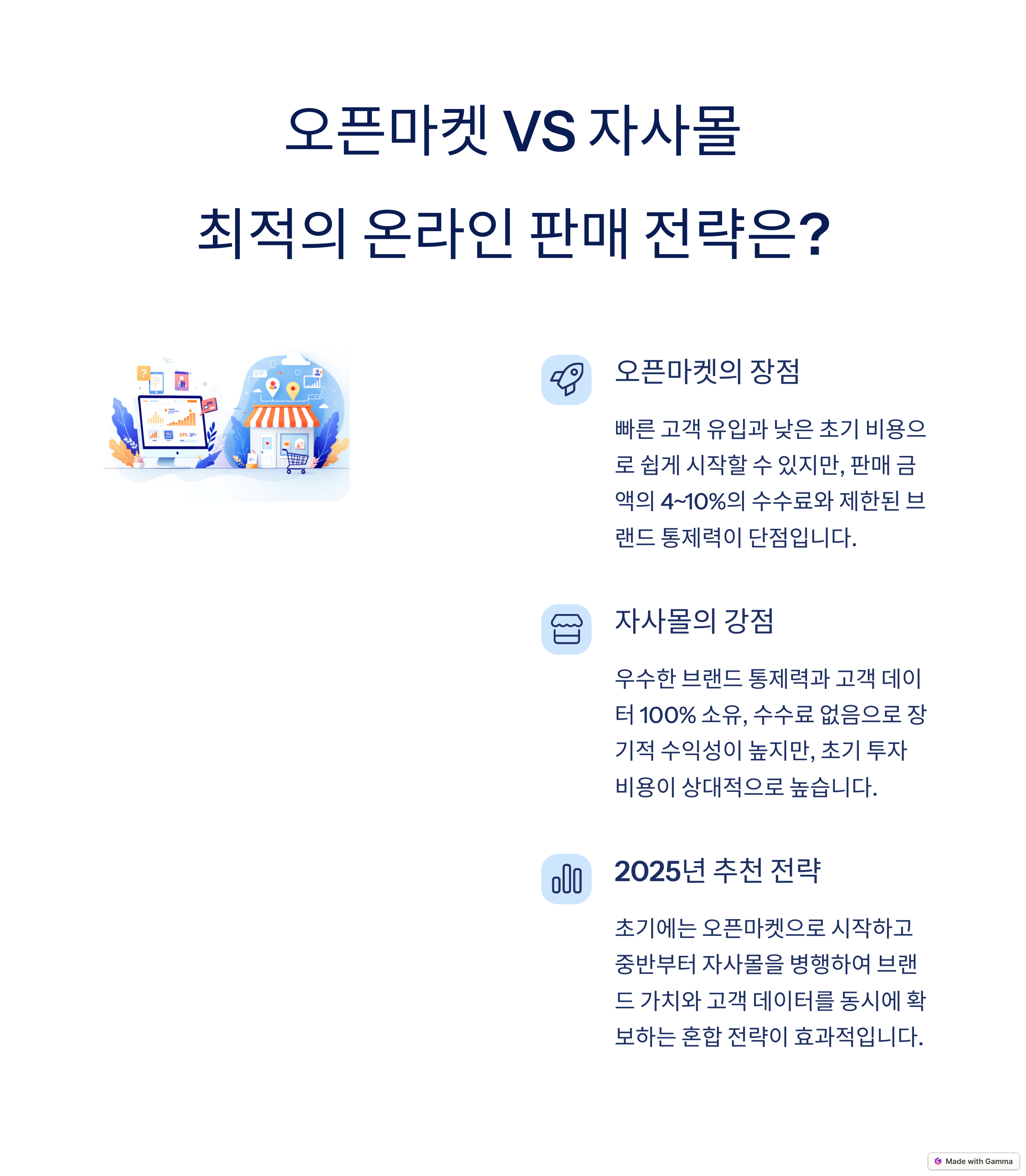 2025년도에는 점진적으로 자사몰의 비중을 높이는 혼합 운영 전략이 추천됩니다.