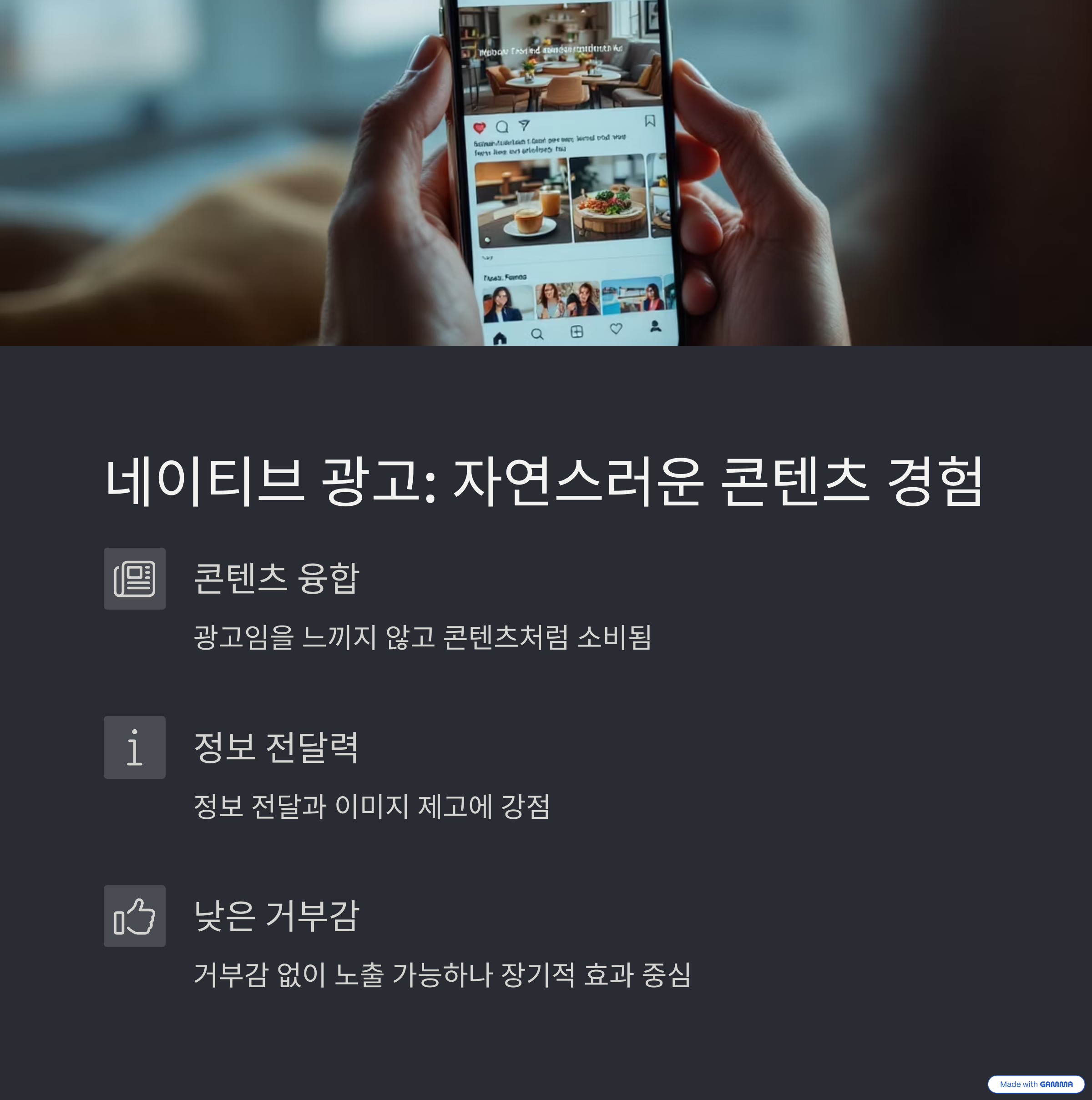 | 네이티브 광고 (NA) | 콘텐츠 안 자연스럽게 삽입 | 거부감 적음 | 직접 전환 적음 | SNS, 언론사 |