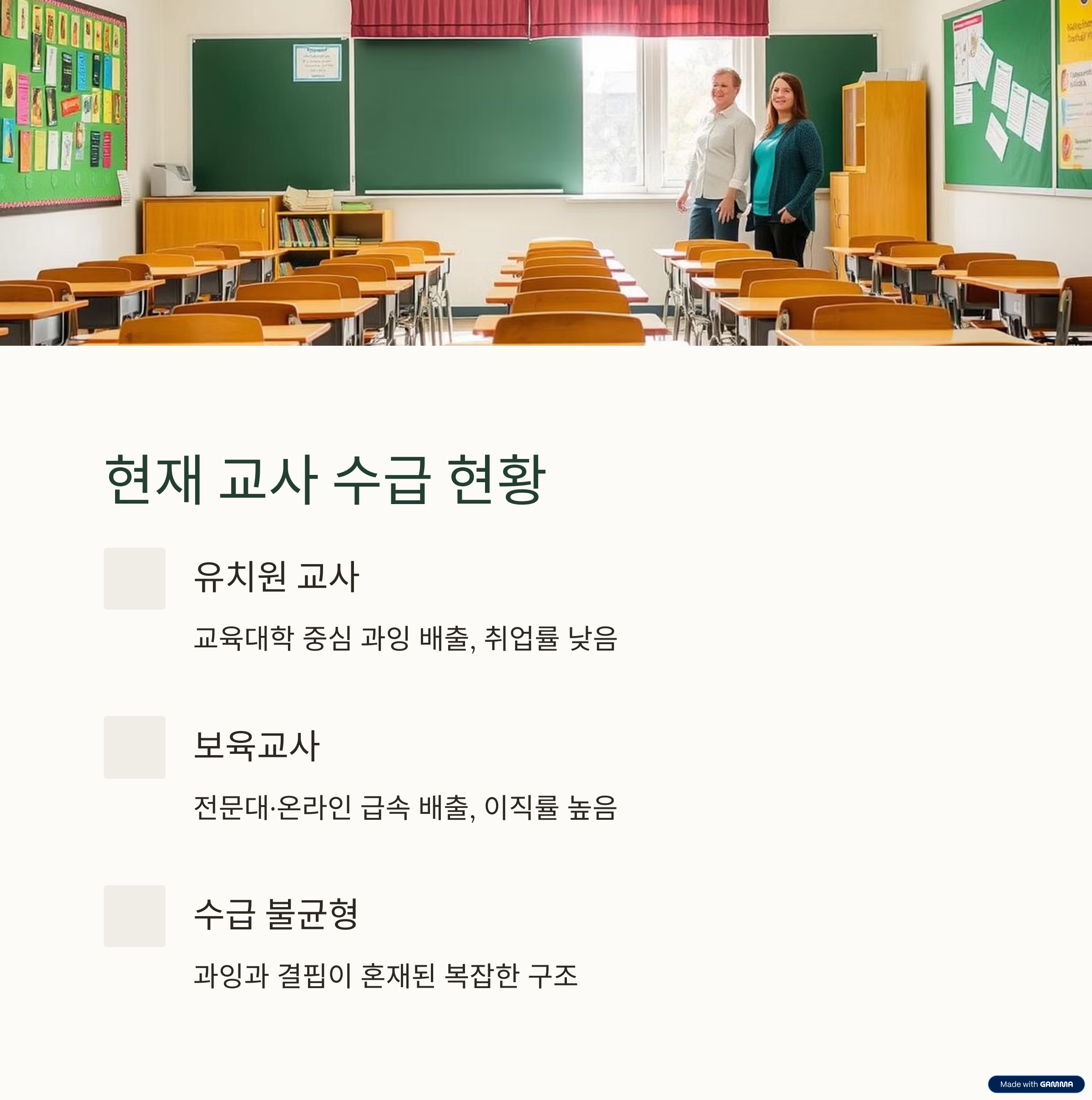 - 일부 지역에서 교사 공급 과잉 → 채용 축소
