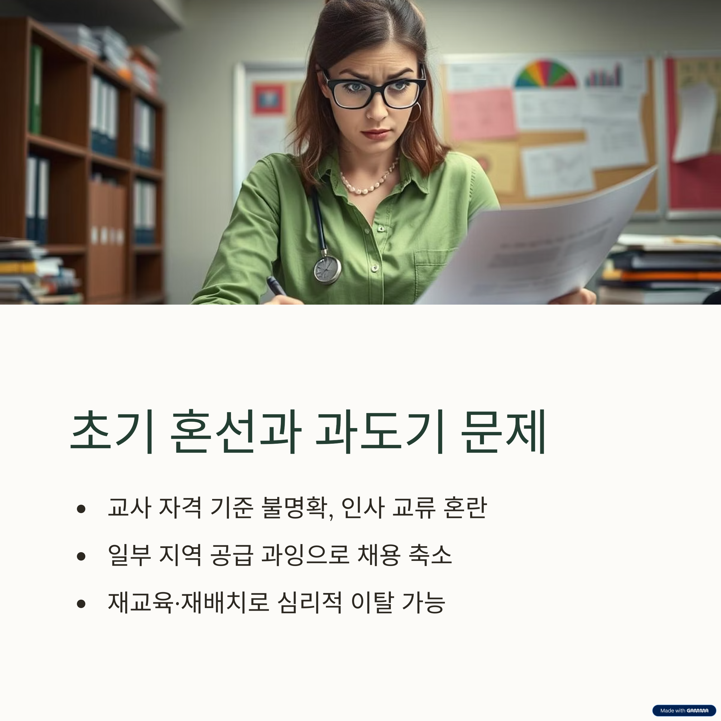 또한 기존 교사들은 재교육·재배치 대상이 되어 심리적 이탈 가능성도 존재합니다.