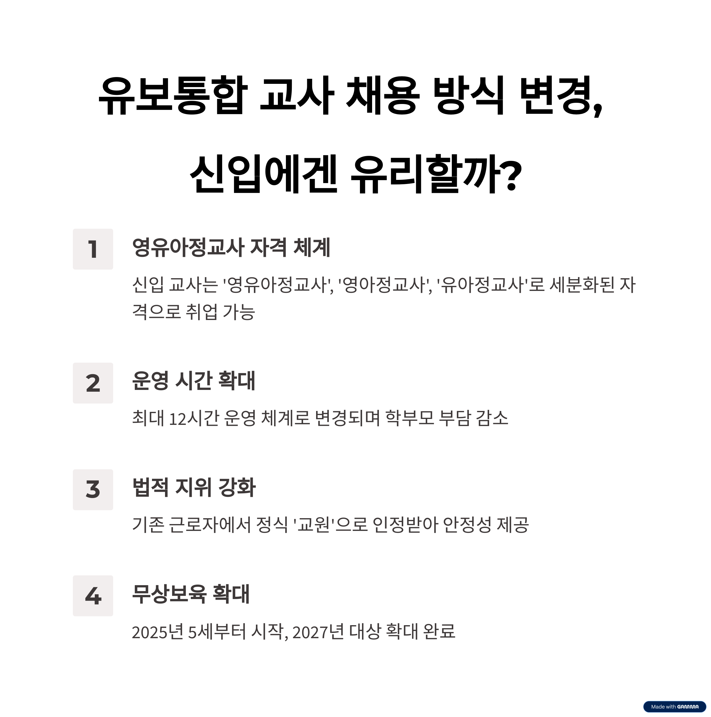 | 유보통합은 신입 교사에게 간명한 자격 체계를 제공합니다. 새로운 자격 체계(영유아정교사, 영아정교사, 유아정교사)로 방향이 명확해졌습니다. 신입 교사들은 추가 과정 없이 통합 자격으로 쉽게 시작할 수 있습니다. 다양한 지원책과 안정된 초봉 체계를 통해 초기 적응을 돕습니다. 처우 개선으로 안정된 교직 생활을 시작할 수 있습니다. |