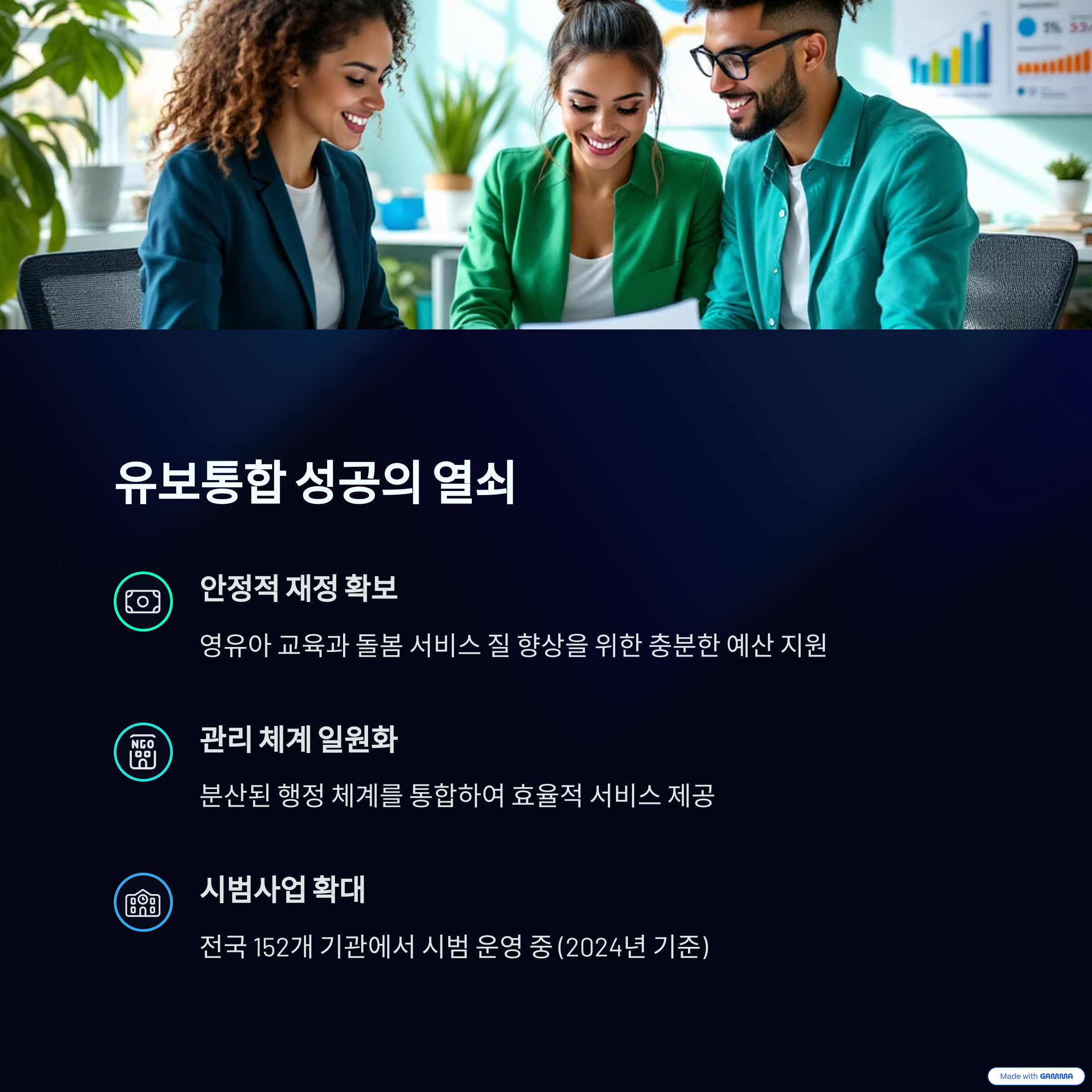 유보통합 정책의 성공은 재정적 안정과 관리 체계 개편에 달려 있습니다.