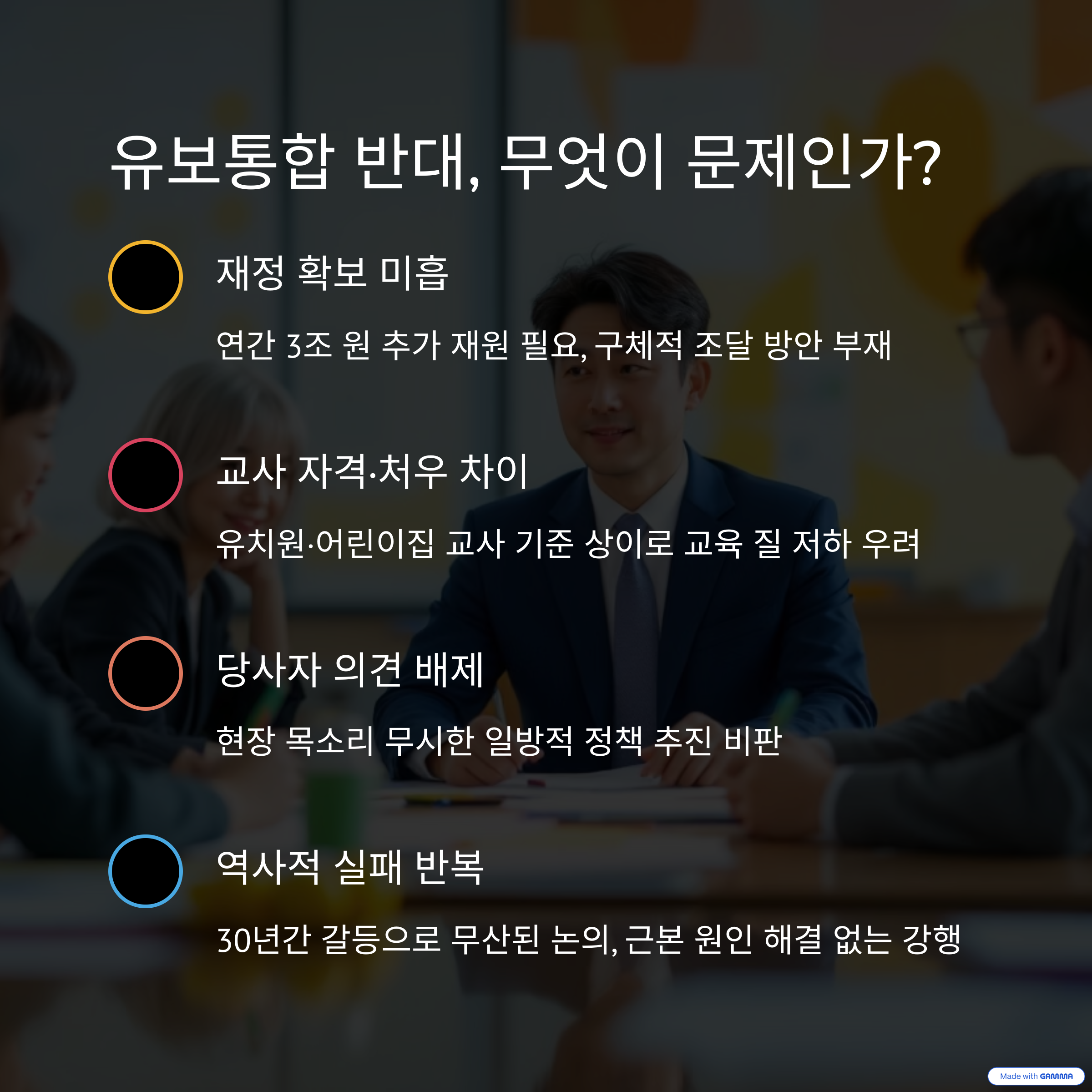 특히, 유보통합추진위원회 내 반대 의견을 무시한 일방적인 정책 강행은 갈등을 심화시키고 있습니다.