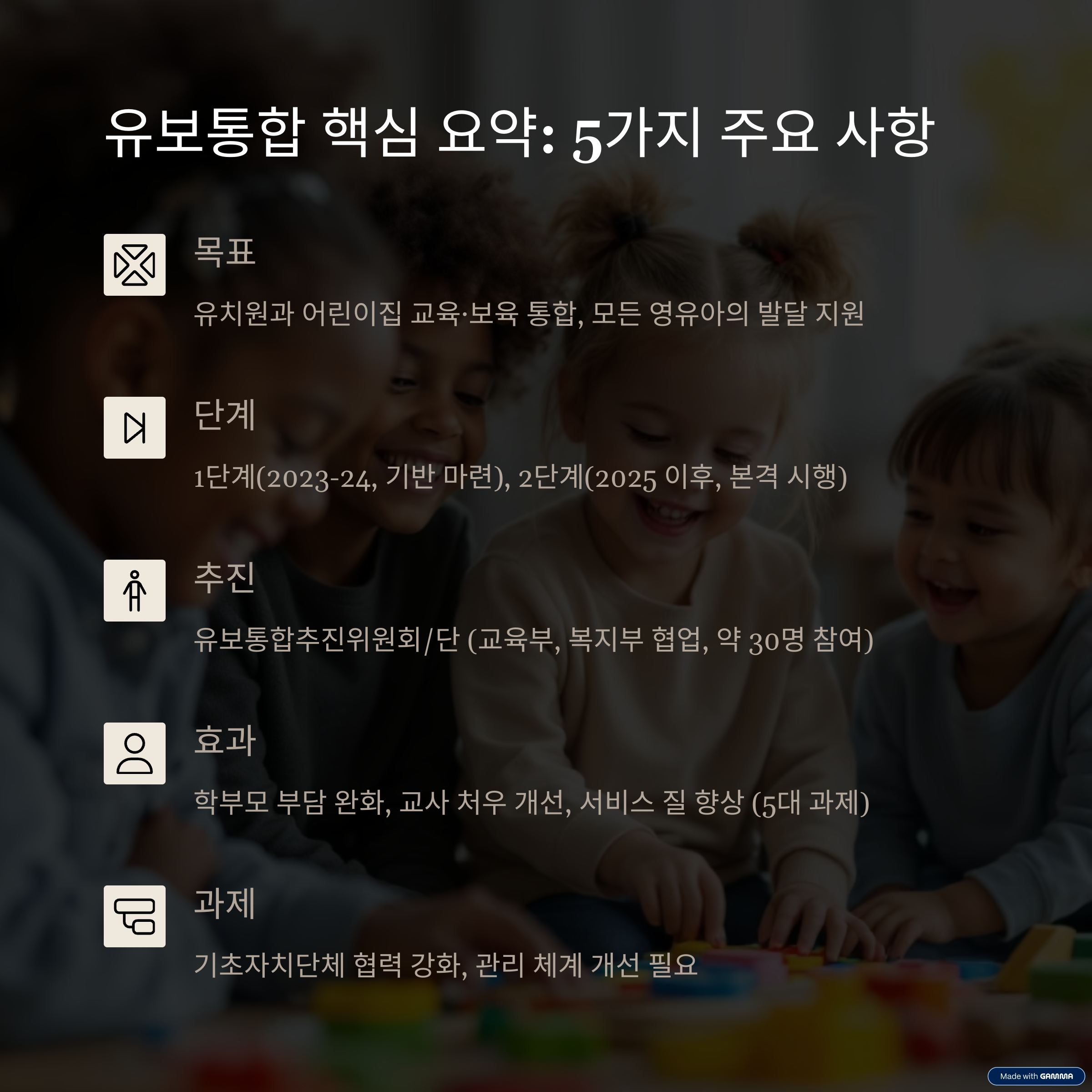 오늘은 유치원과 어린이집의 통합 정책을 중심으로 한 유보통합 내용을 알려드리겠습니다.