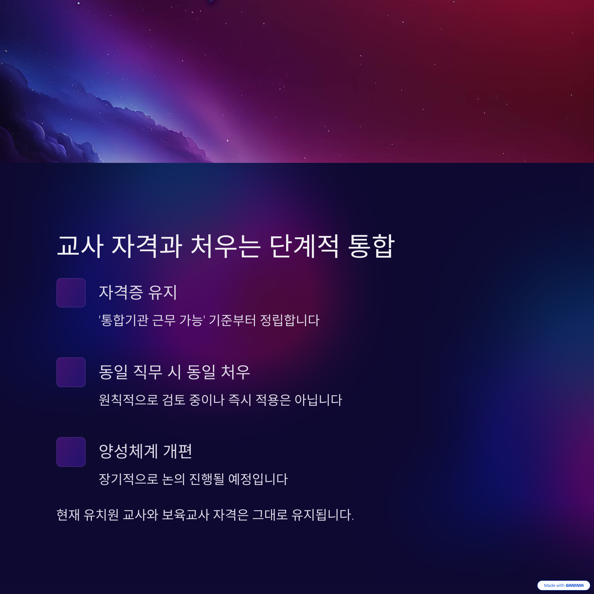 교사 간 갈등을 고려해 자격·처우 통합은 '단계적' 접근이 원칙입니다.