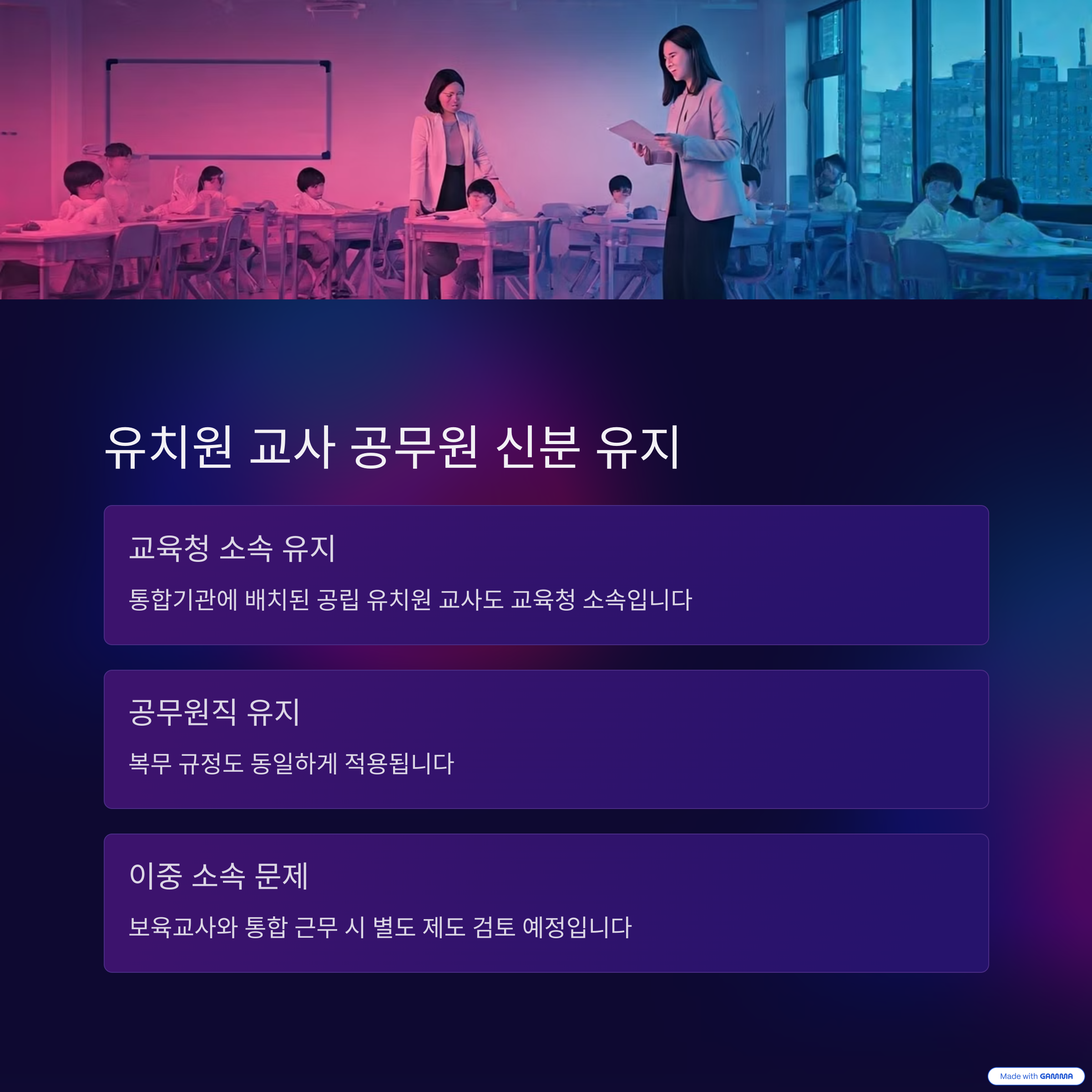 공립 유치원 교사의 공무원 신분은 유보통합 이후에도 변화가 없으며,