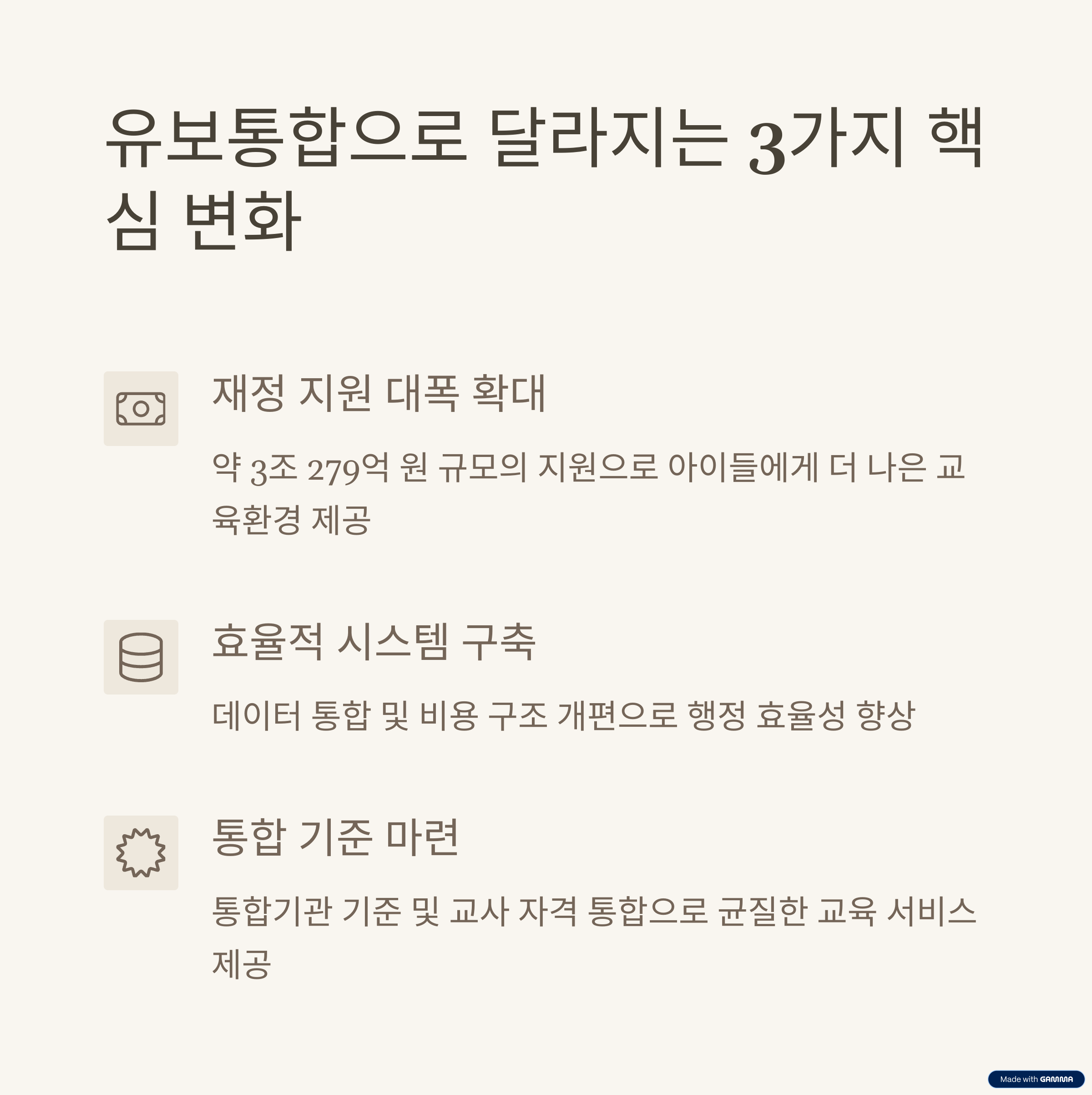 | 학부모는 하나의 통합 시스템에서 일관된 서비스를 받을 수 있게 됩니다. 입학 방식의 표준화로 대기 신청 과정이 더욱 단순화될 예정입니다. 통합적 돌봄 시스템을 통해 학부모의 시간 관리 부담이 경감될 것입니다. 재정 지원 개선으로 교육비 부담이 일부 완화될 가능성이 있습니다. 안내와 정보 접근성 강화로 학부모들이 정책 변화를 더 잘 이해하고 활용할 수 있습니다. |