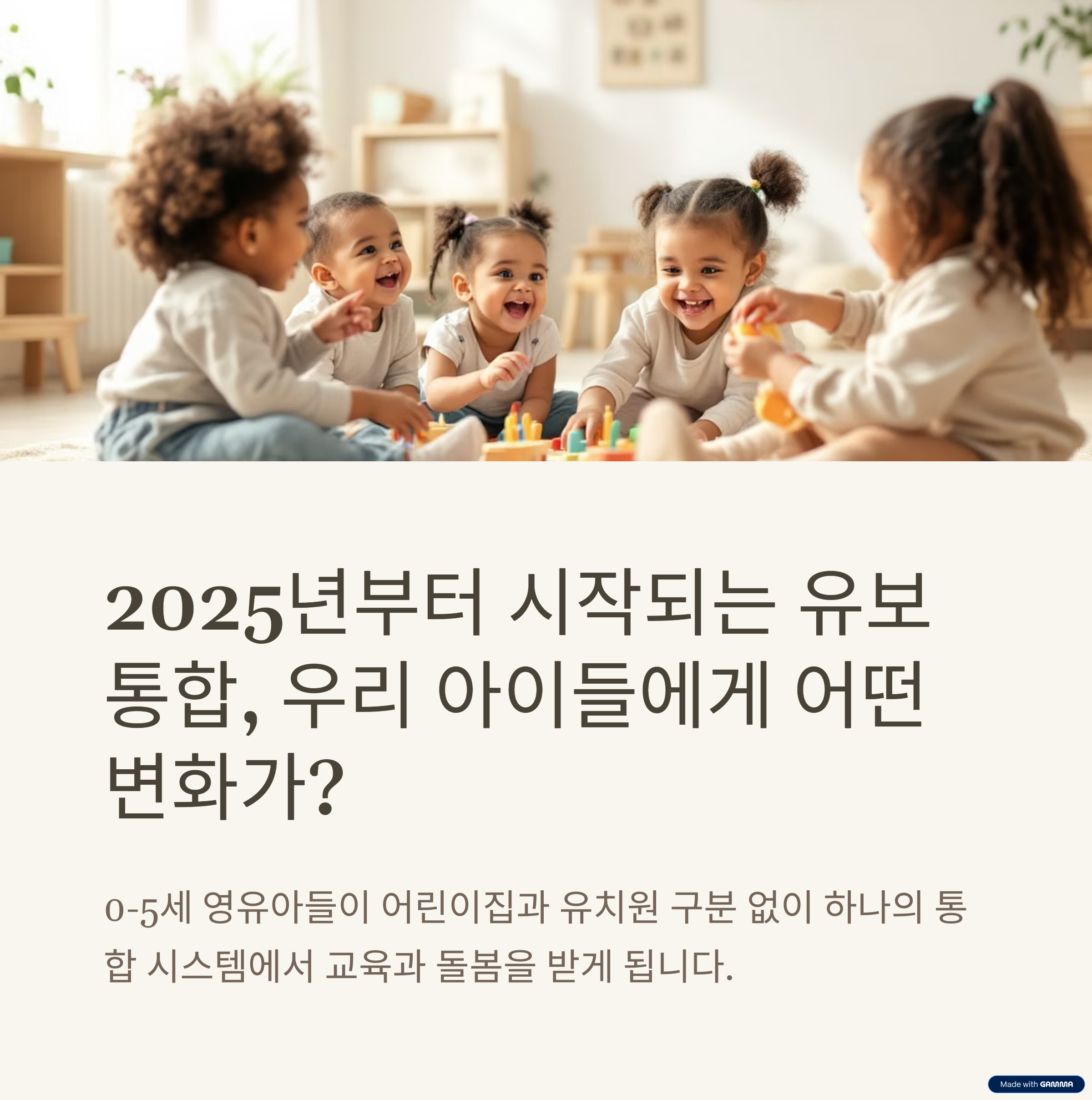 유보통합은 어린이집과 유치원을 통합해 영유아들에게 통합적 교육과 돌봄을 제공합니다.