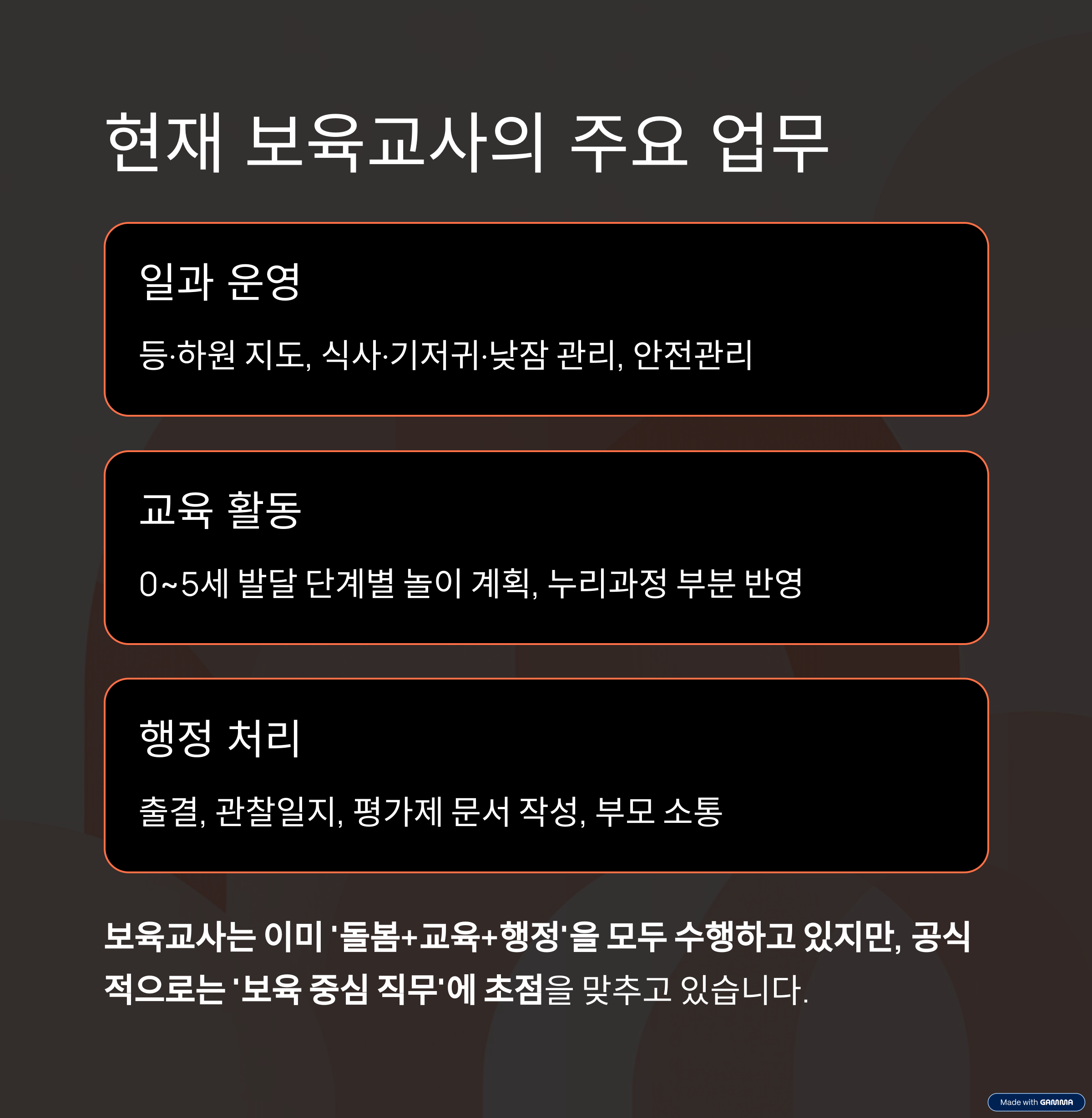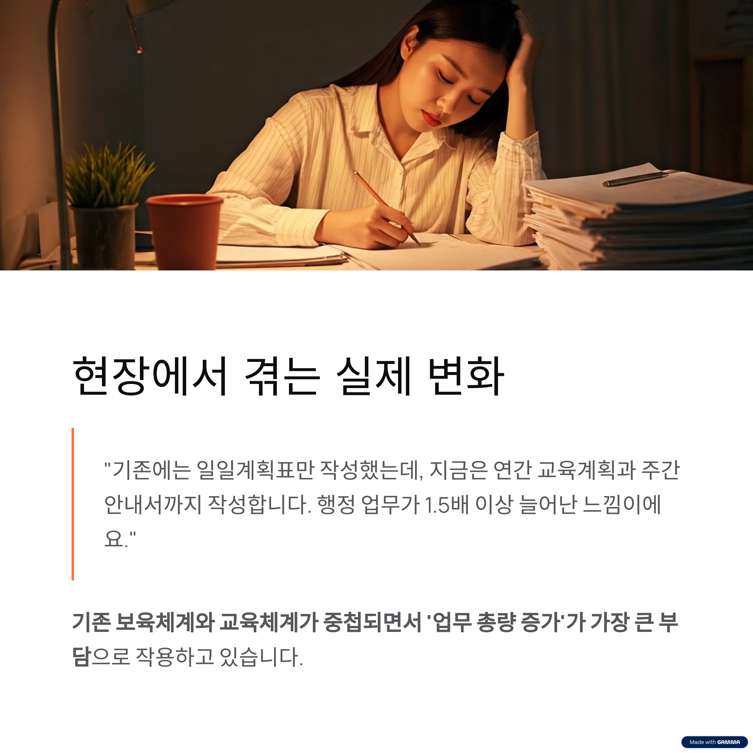 즉, 기존 보육체계와 교육체계가 중첩되면서 ‘업무 총량 증가’가 가장 큰 부담으로 작용하고 있습니다.