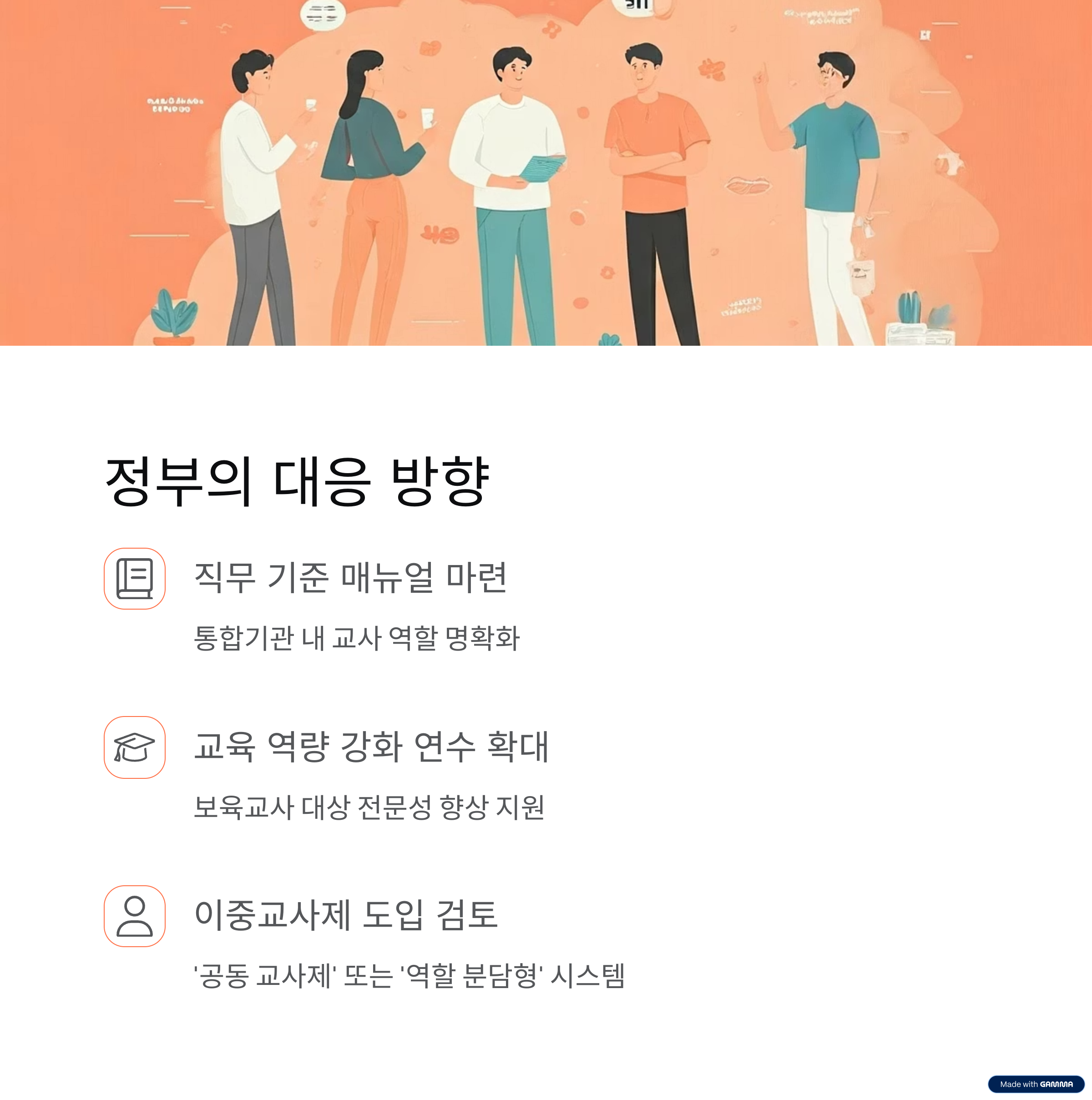 - 통합기관 근무 시 ‘공동 교사제’ 또는 ‘역할 분담형 이중교사제’ 도입 검토