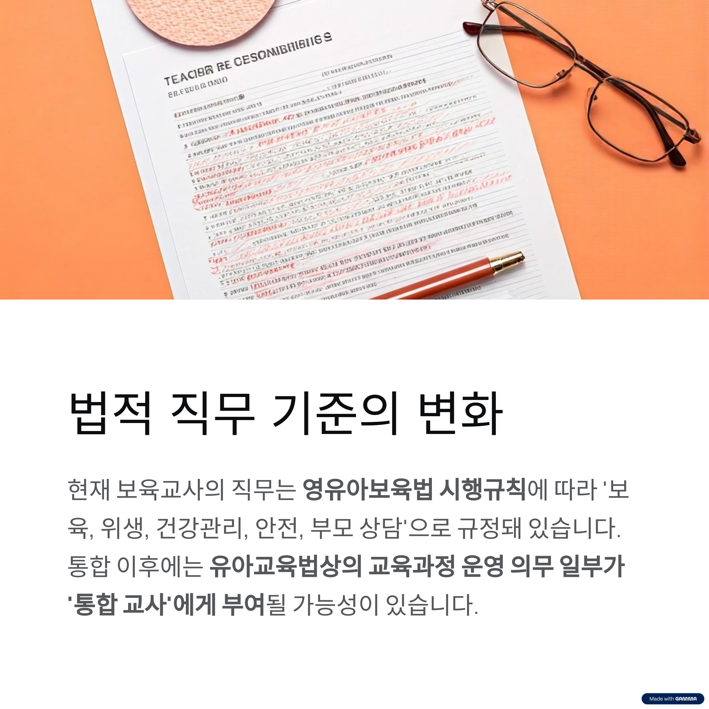 유아교육법상의 교육과정 운영 의무 일부가 ‘통합 교사’에게 부여될 가능성이 있습니다.