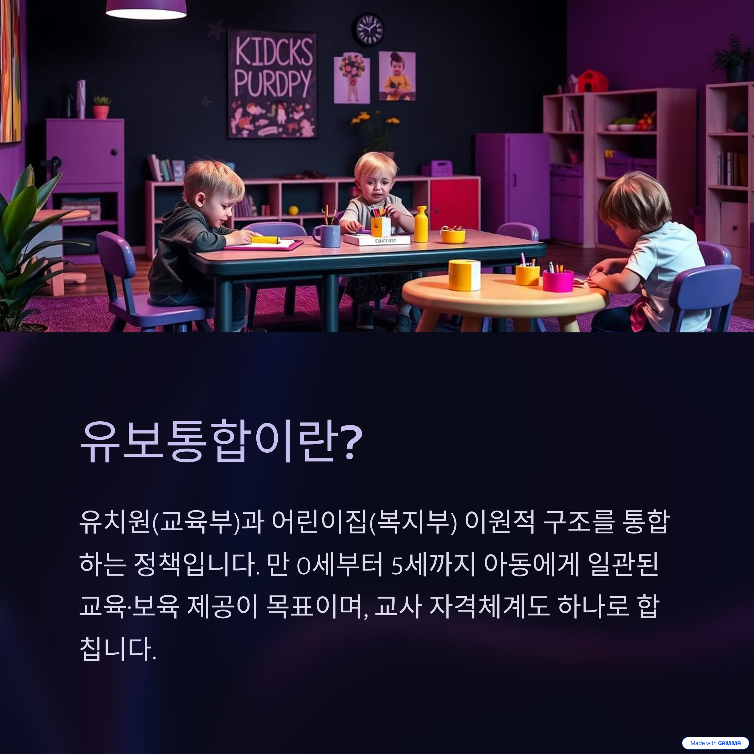 유보통합은 유치원(교육부 관할)과 어린이집(보건복지부 관할)의 이원적 구조를 하나로 합치는 국가 정책입니다.