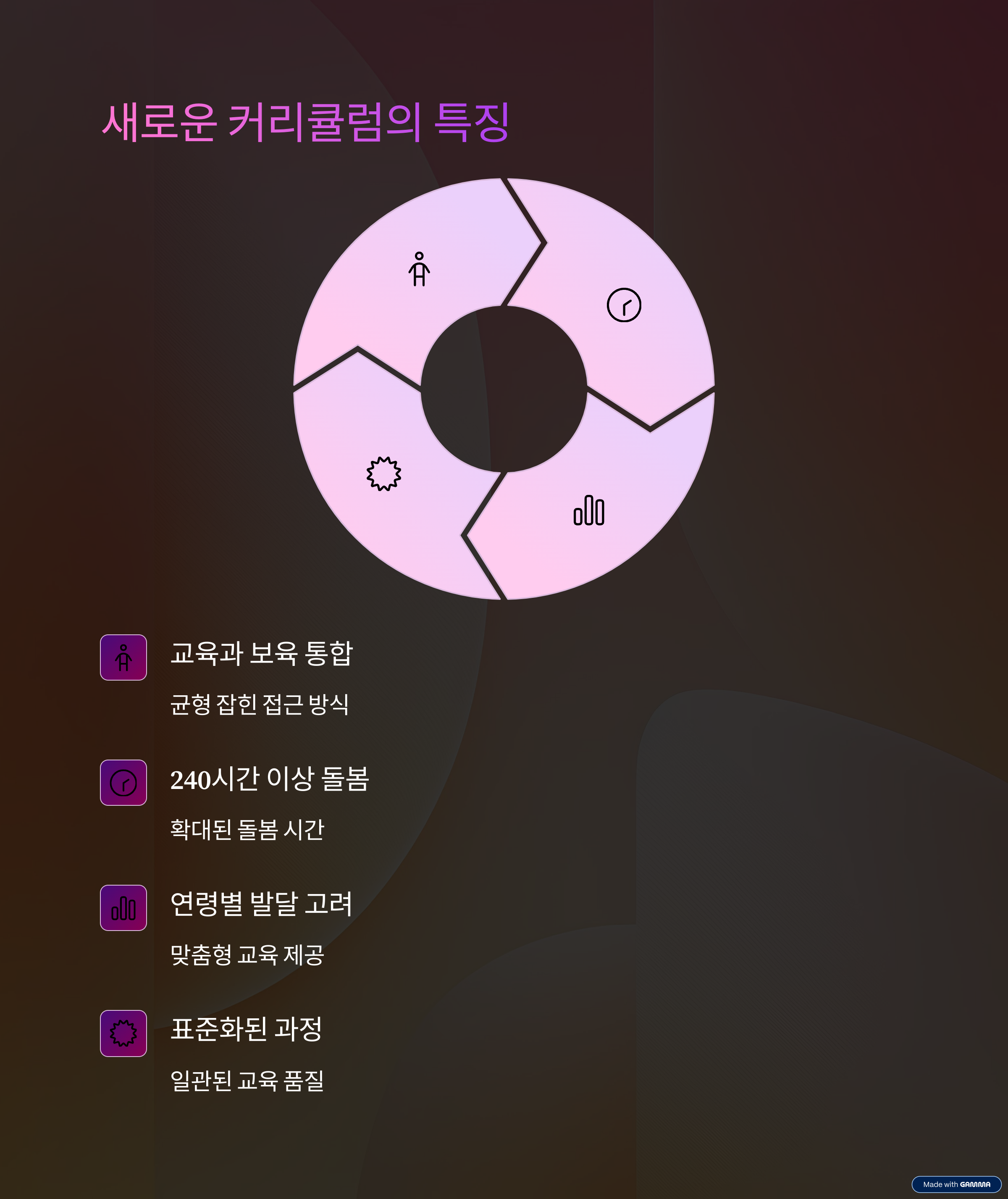 | 유보통합은 통합된 운영 체제와 커리큘럼을 도입하기 위한 정책 변화입니다. 가장 큰 차이는 교육과 보육의 통합에 초점이 맞춰진 점입니다. 새로운 커리큘럼은 240시간 이상의 돌봄 시간을 포함하며, 각기 다른 연령대의 발달 특성을 고려할 예정입니다. 기존 각 기관에서 사용되던 교육 과정은 점진적으로 새로운 표준화된 과정으로 대체될 것으로 보입니다. 이러한 변화는 학부모와 아이들의 편익 증가를 목표로 실행될 예정입니다. |