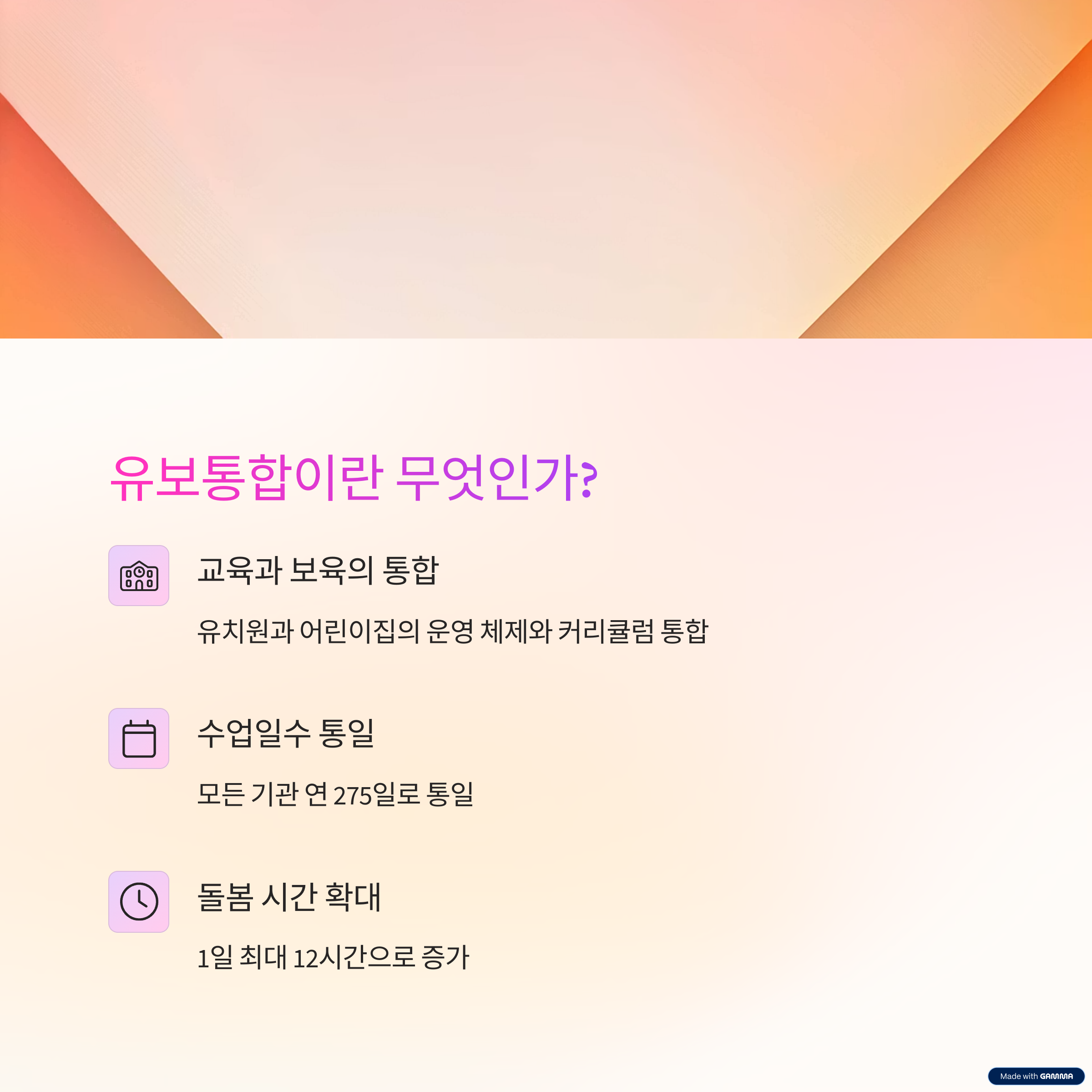 유보통합의 가장 큰 변화 중 하나는 돌봄 시간과 수업일수의 통합 확대입니다.