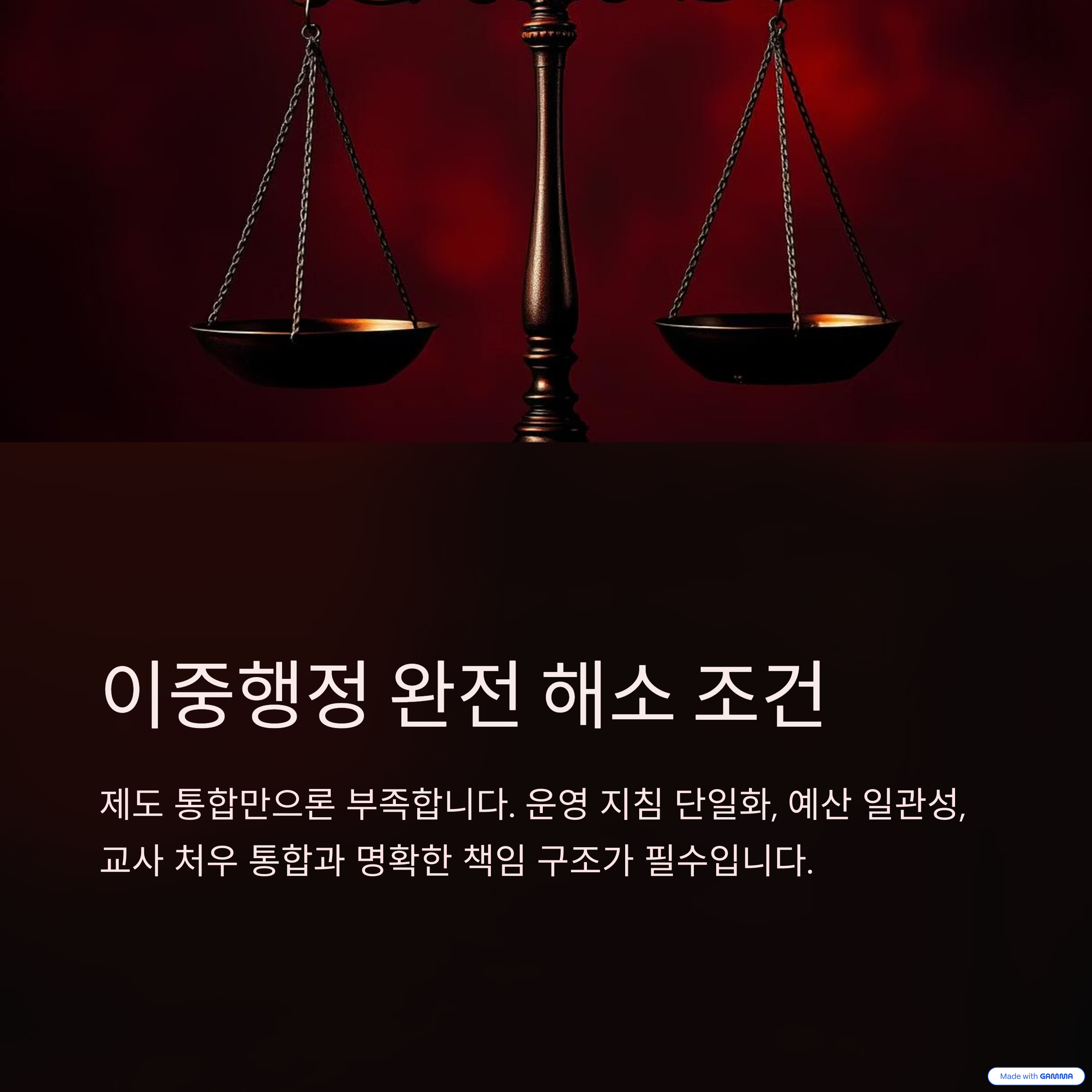 관건은 운영 지침의 단일화, 예산 기준의 일관성, 교사 처우의 통합성 확보입니다.