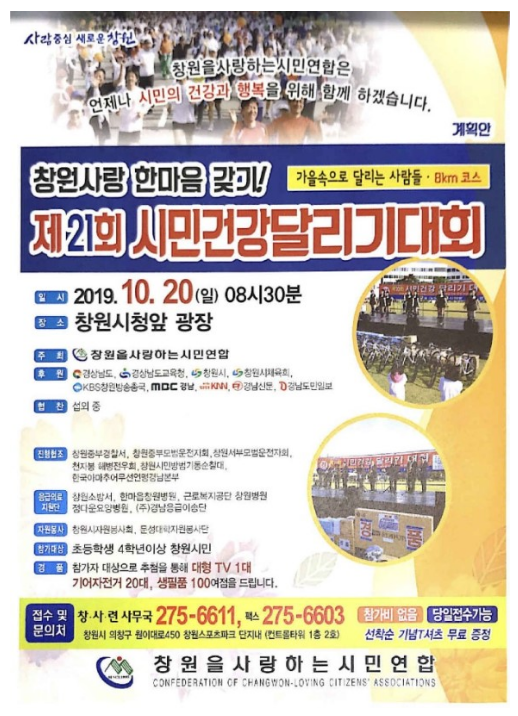 제21회 창원 시민건강달리기대회 정보창원사랑 한마음 갖기제21회 시민건강달리기대회를 2019년 10월 20일(...