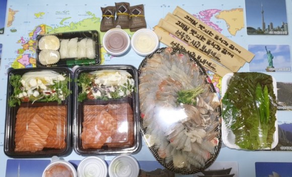 바다회 1개, 연어샐러드 2개 주문한 뷰입니다