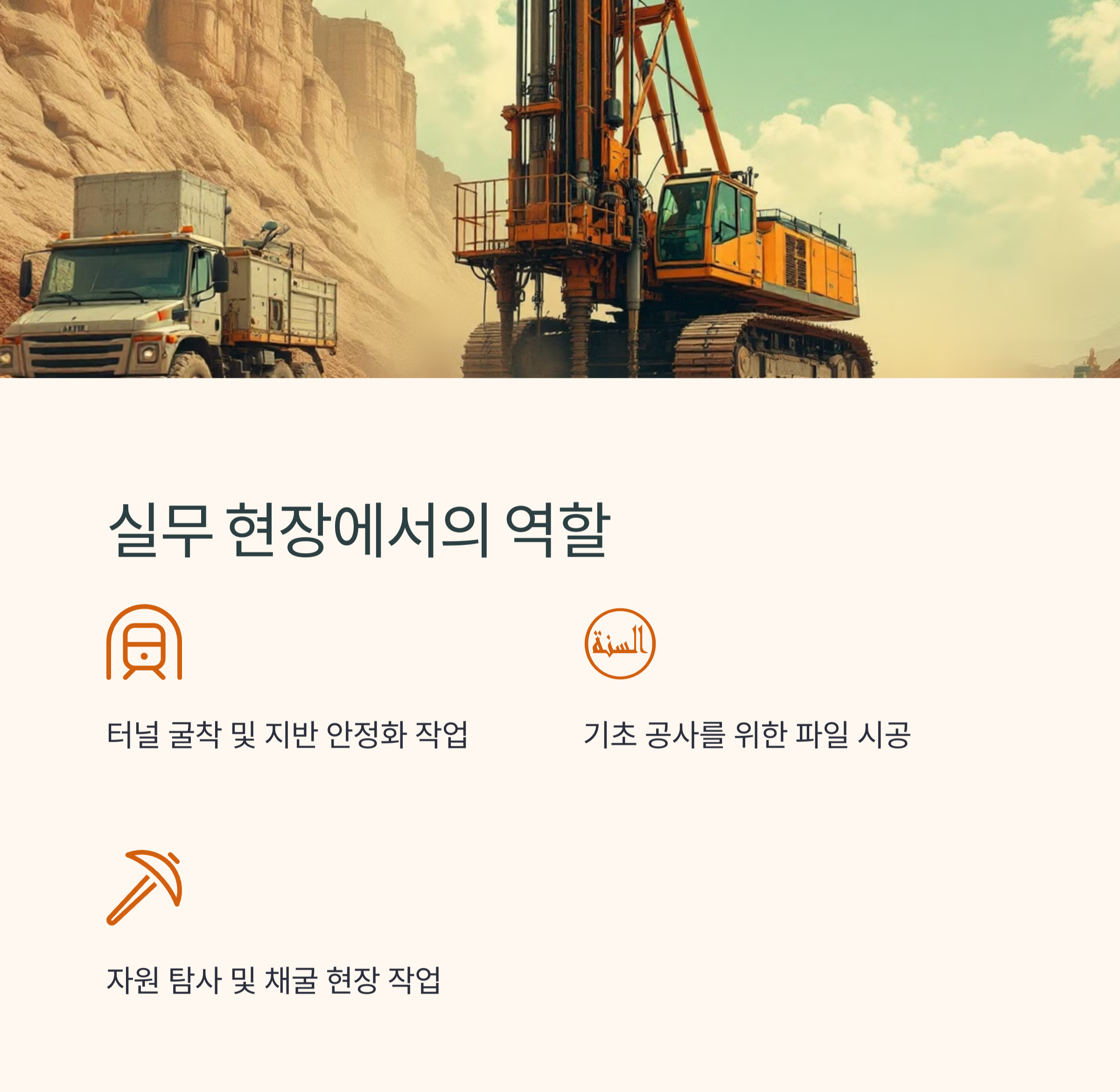 - 지열 발전 및 채굴: 지열 발전소 건설 및 광산 채굴 공사에서 천공기를 운용합니다.