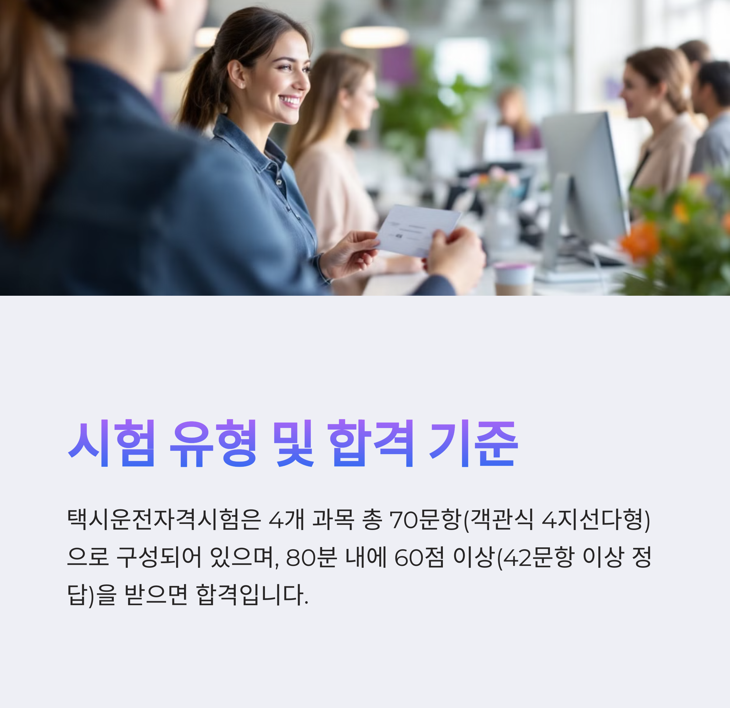 택시운전자격시험은 비교적 쉬운 편이며, 합격률도 80% 이상입니다. 기출문제를 몇 번 풀어보면 충분히 합격할 수 있어요.