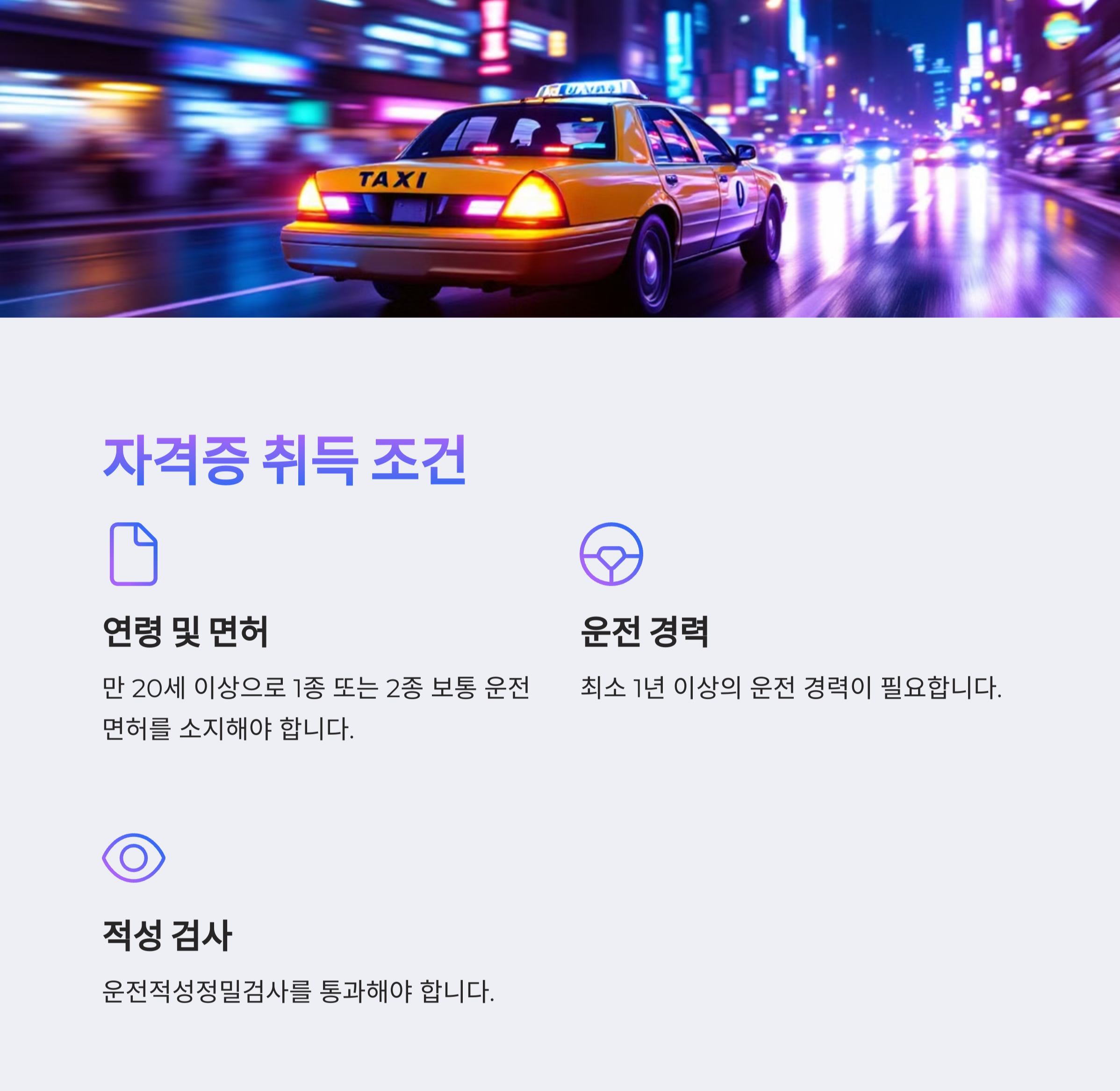 택시운전자격증을 취득하려면 몇 가지 조건을 충족해야 합니다. 아래 표에서 주요 요건을 확인하세요!