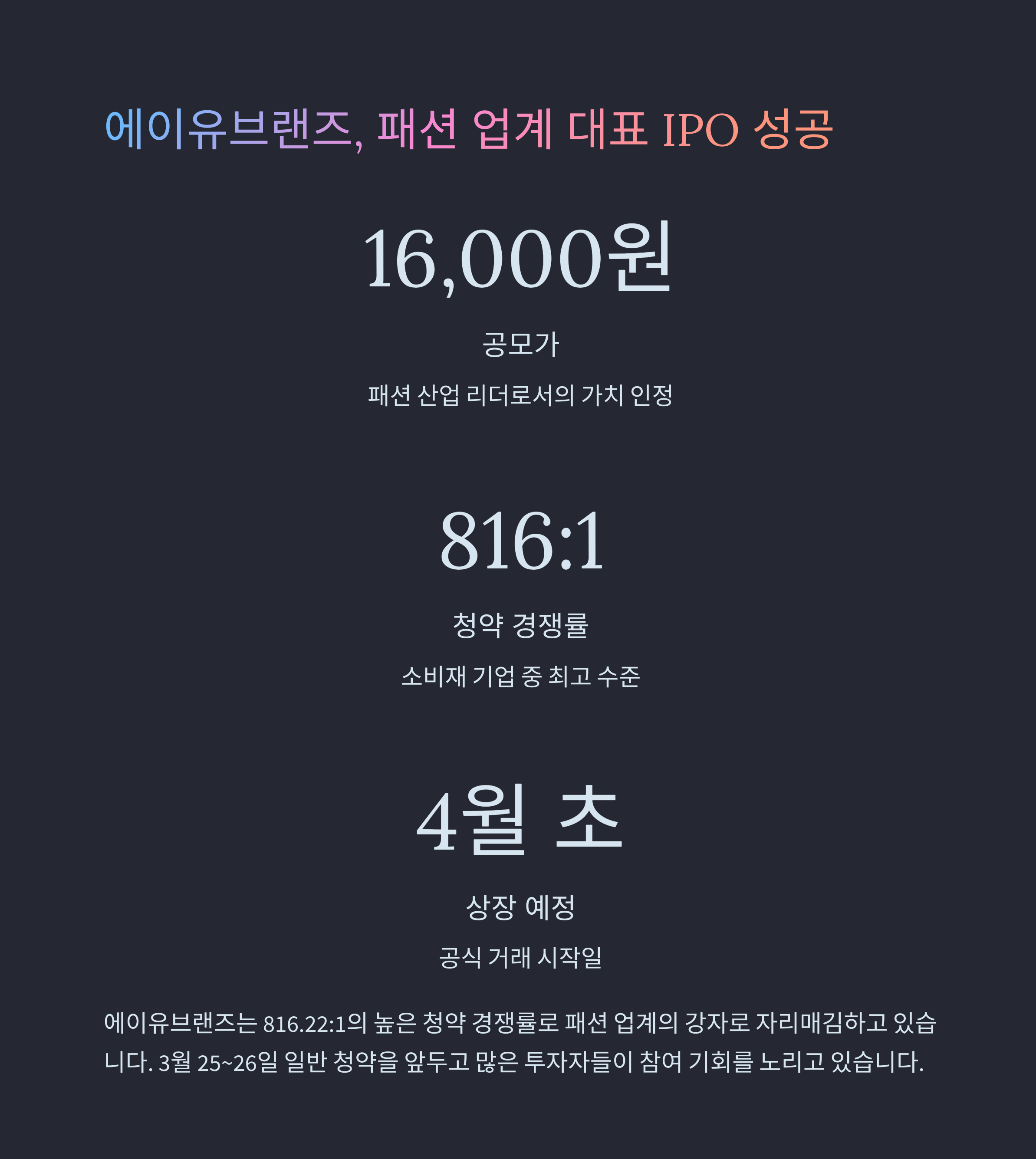 에이유브랜즈는 패션 브랜드 락피쉬웨더웨어를 운영하며 글로벌 브랜드로 도약을 준비하고 있습니다. 이번 IPO를 통해 자금을 확보하고, 글로벌 시장 진출을 가속화할 계획입니다. 공모가는 16,000원으로 희망 밴드 상단에서 결정되었으며, 청약 경쟁률은 816.22:1을 기록했습니다. 상장 예정일은 2025년 4월 3일로, 코스닥 시장에서 첫 거래가 시작됩니다.