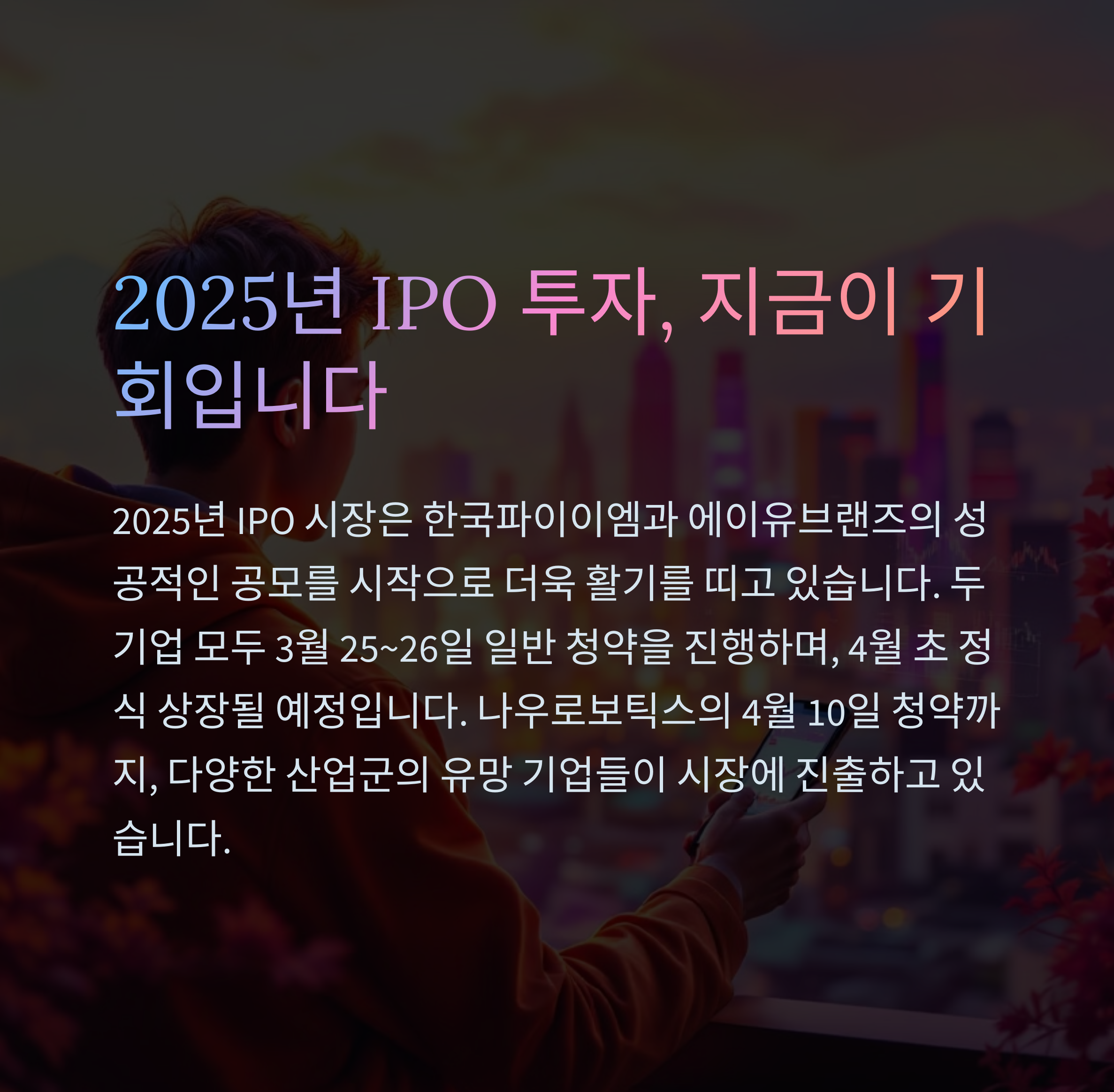 최근 공모주 시장에서는 한국파이이엠, 에이유브랜즈, 나우로보틱스가 높은 관심을 받고 있습니다. 한국파이이엠은 MIM(Metal Injection Molding) 기술을 보유한 국내 1위 기업으로, 기관 투자자들의 긍정적인 평가를 받았습니다. 공모가는 11,200원으로 확정되었으며, 청약 경쟁률은 무려 1,214.55:1을 기록하며 흥행에 성공했습니다. 상장 예정일은 2025년 4월 4일로 코스닥 시장에 입성할 예정입니다.